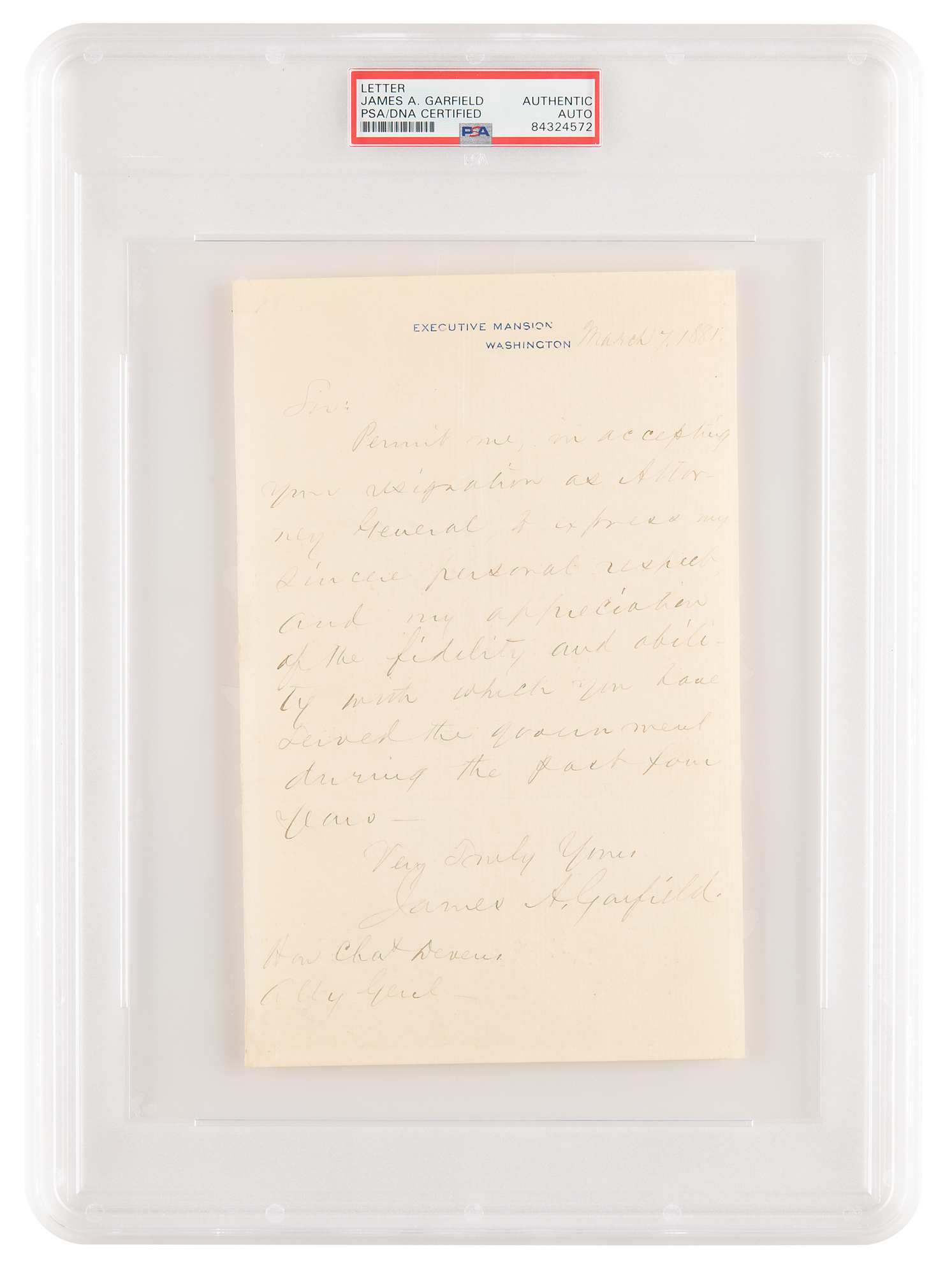 ALS as president, one page, 5.25 x 8.5, Executive Mansion letterhead, March 7, 1881. Handwritten letter to Attorney General Charles Devens, written three days after Garfield's inauguration as president. In full: "Permit me, in accepting your resignation as Attorney General, to express my sincere personal respect and my appreciation of the fidelity and ability with which you have served the government during the past four years." In fine condition. Encapsulated in a PSA/DNA authentication holder.