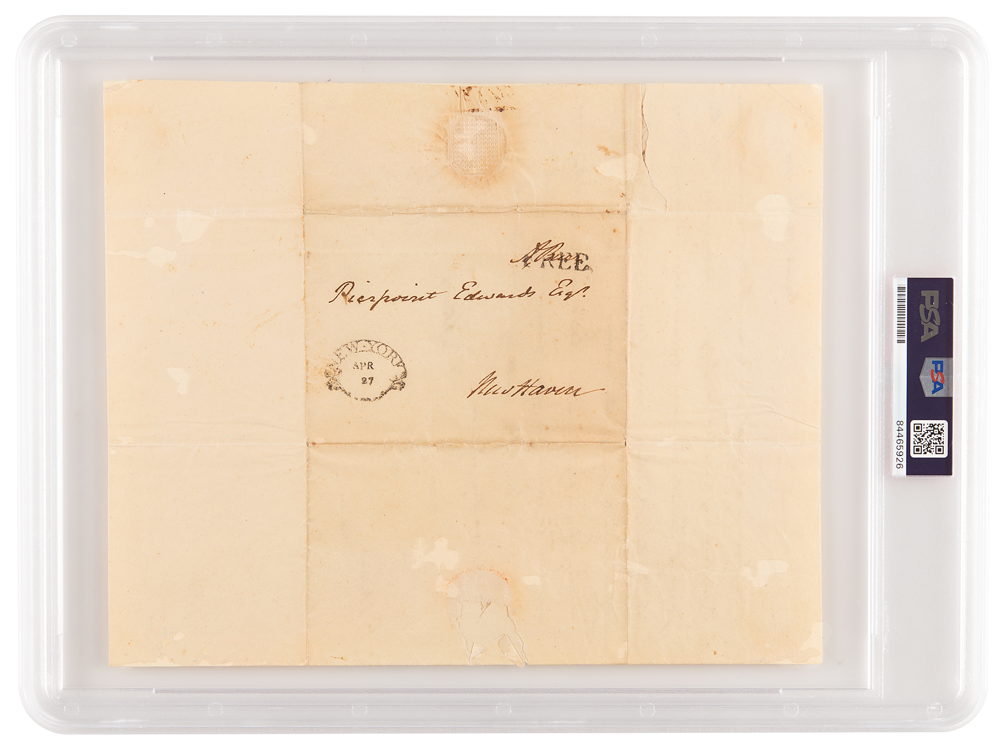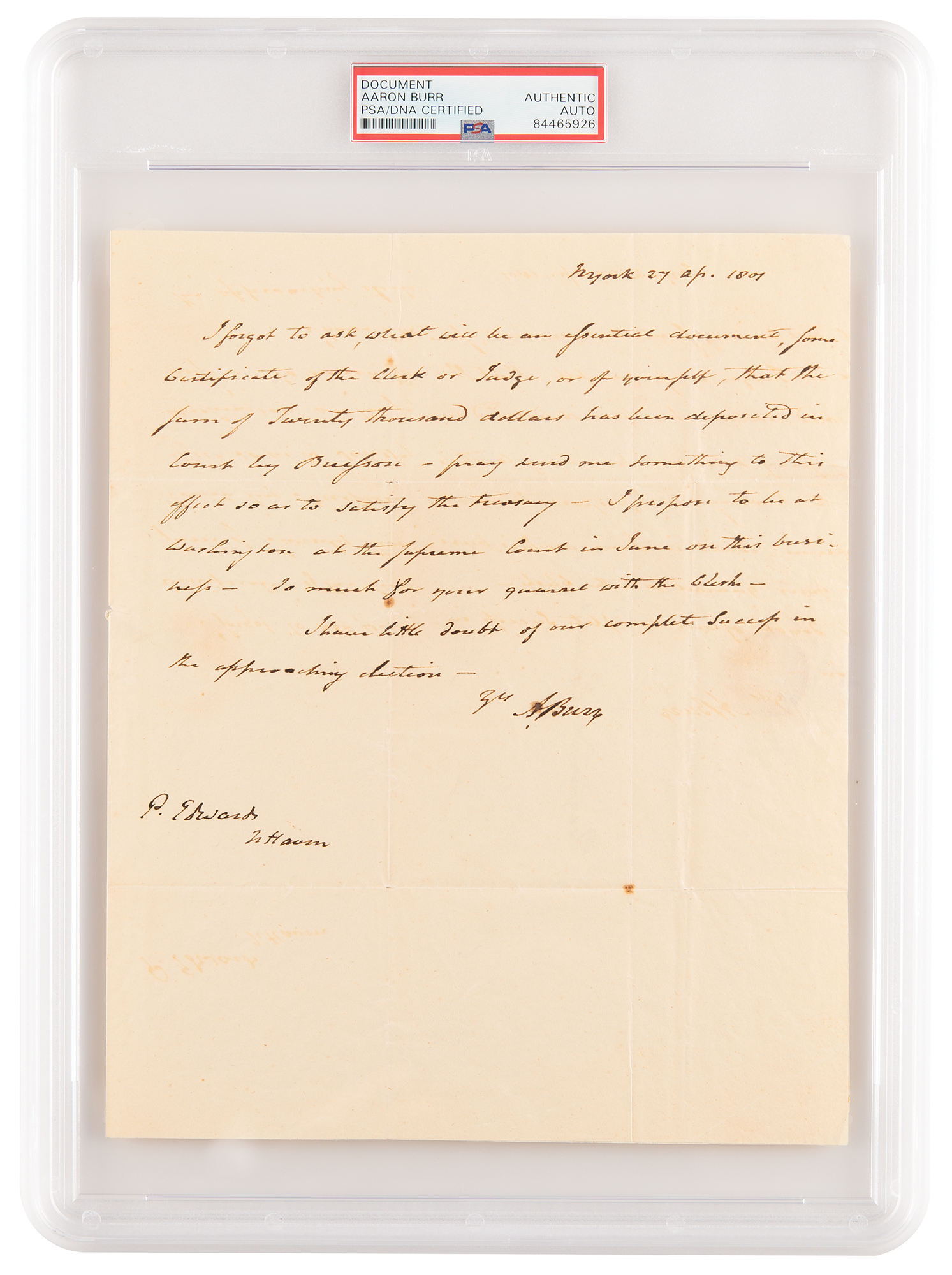 ALS signed “A. Burr,” one page, 7.75 x 9.5, April 27, 1801. Handwritten letter to Pierpont Edwards, United States Attorney for the District of Connecticut. In full: "I forgot to ask, what will be an essential document, some certificate of the clerk or judge, or of yourself, that the sum of Twenty thousand dollars has been deposited in Court by Buisson—pray send me something to this effect to satisfy the treasury—I propose to be at Washington at the Supreme Court in June on this business—so much for your quarrel with the Clerk. I have little doubt of our complete success in the approaching election." Addressed on the reverse in Burr's hand, and franked over a "Free" stamp in the upper right, "A. Burr." In fine condition. Encapsulated in a PSA/DNA authentication holder.