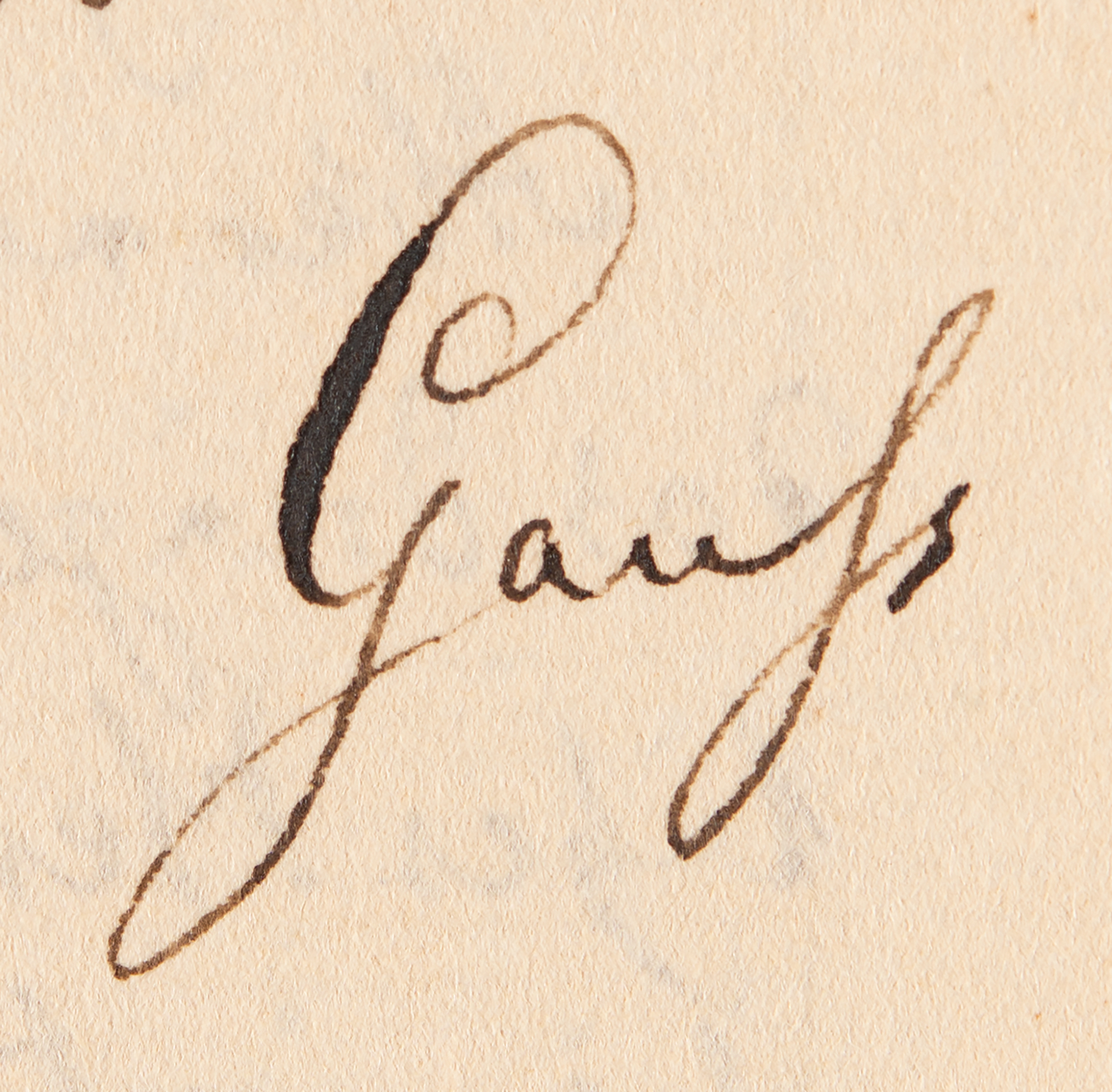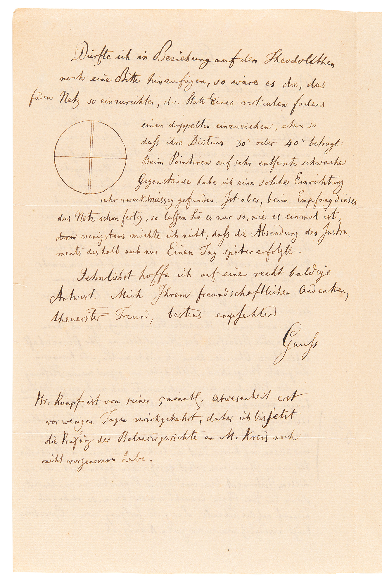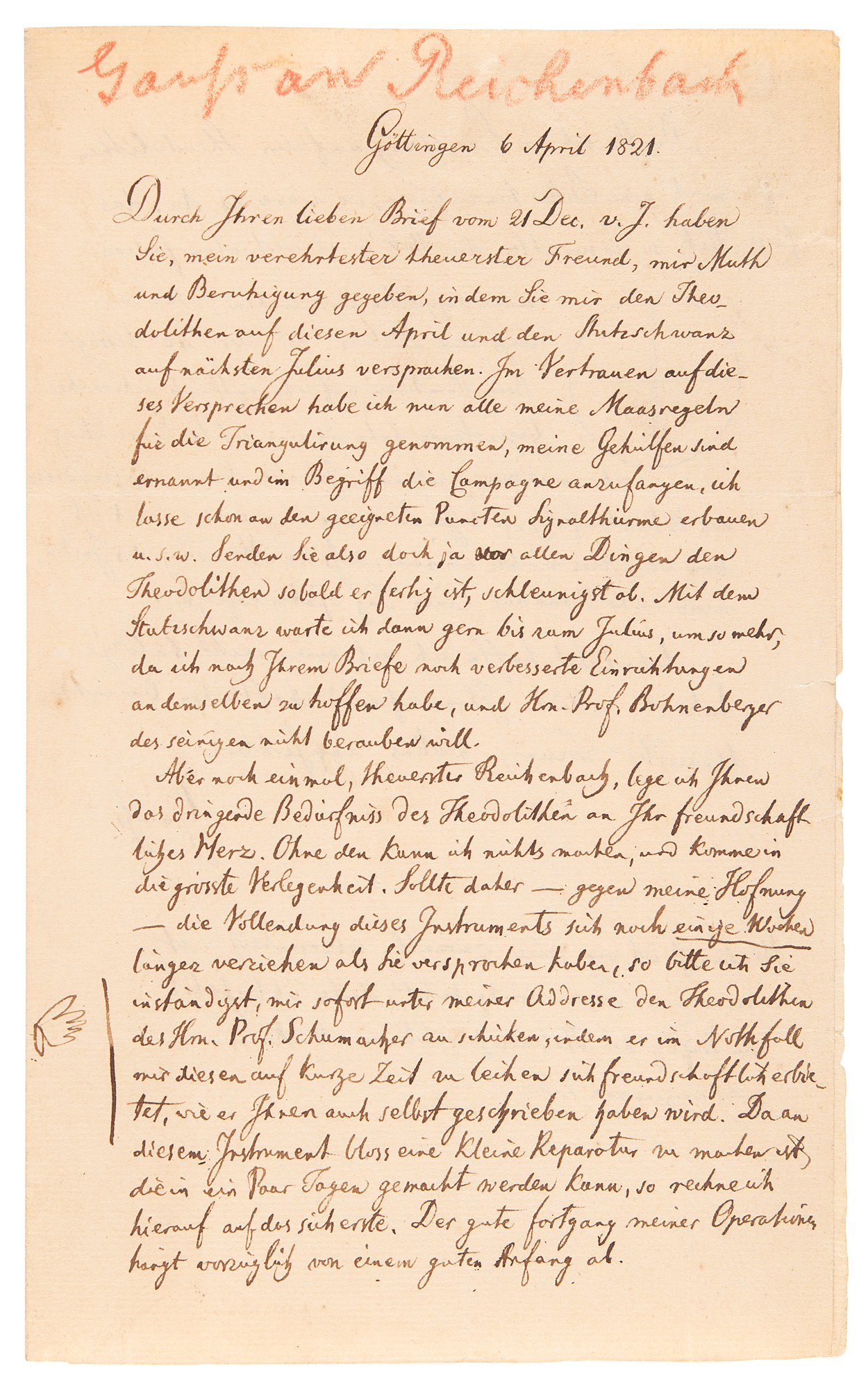 German mathematician and physical scientist (1777-1855) who contributed significantly to many fields, including geometry and astronomy; he is often referred to as the 'prince of mathematicians' or 'the greatest mathematician since antiquity.' ALS in German, signed “Gauss,” one page both sides, 4.75 x 7.75, April 6, 1821. Handwritten letter to Munich engineer Georg von Reichenbach concerning the dispatch of a theodolite, a precision optical instrument for measuring angles, incorporating two small sketches. In part (translated): "Your dear letter of December 21st of last year has given me, my most esteemed and dearest friend, courage and reassurance, as you promised me the theodolite for this April and the stadia rod for next July. Trusting in this promise, I have now taken all my measures for the triangulation, my assistants have been appointed and are about to begin the campaign; I am already having signal towers built at the suitable points, etc. So please send the theodolite as soon as it is ready, without delay. With regard to the stadia rod, I am willing to wait until July, especially since, according to your letter, I have further improvements to hope for, and I do not wish to deprive Mr. Prof. Bohneberger of his. But once again, dearest Reichenbach, I impress upon your friendly heart the urgent need for the theodolite. Without it, I can do nothing and am in the greatest difficulty. Should, therefore—against my hope—the completion of this instrument be delayed by a few weeks longer than you promised, I earnestly request you to send me immediately, under my address, the theodolite of Mr. Prof. Schumacher, as he kindly offers to lend it to me for a short time in case of need, as he will also have written to you himself. Since only a small repair needs to be made to this instrument, which can be done in a few days, I count on this as the surest option. The successful progress of my operation depends primarily on a good start. May I add one more request regarding the theodolite, it would be to set up the thread network in this way [a small drawing], i.e., instead of a single vertical thread, to insert a double one, with a distance of about 30" or 40". I have found such an arrangement very useful when sighting very distant faint objects. But if, upon receipt of this, the network is already finished, leave it as it is, at least I would not want the dispatch of the instrument to be delayed by even one day." In fine condition.