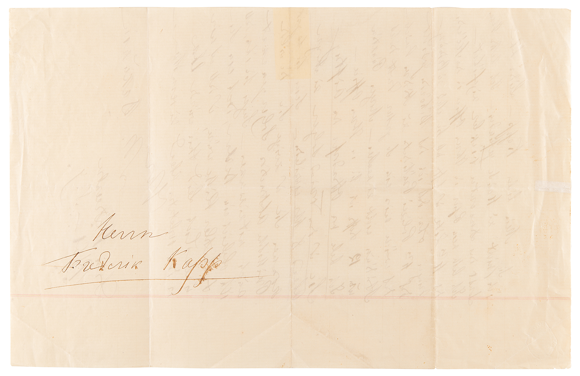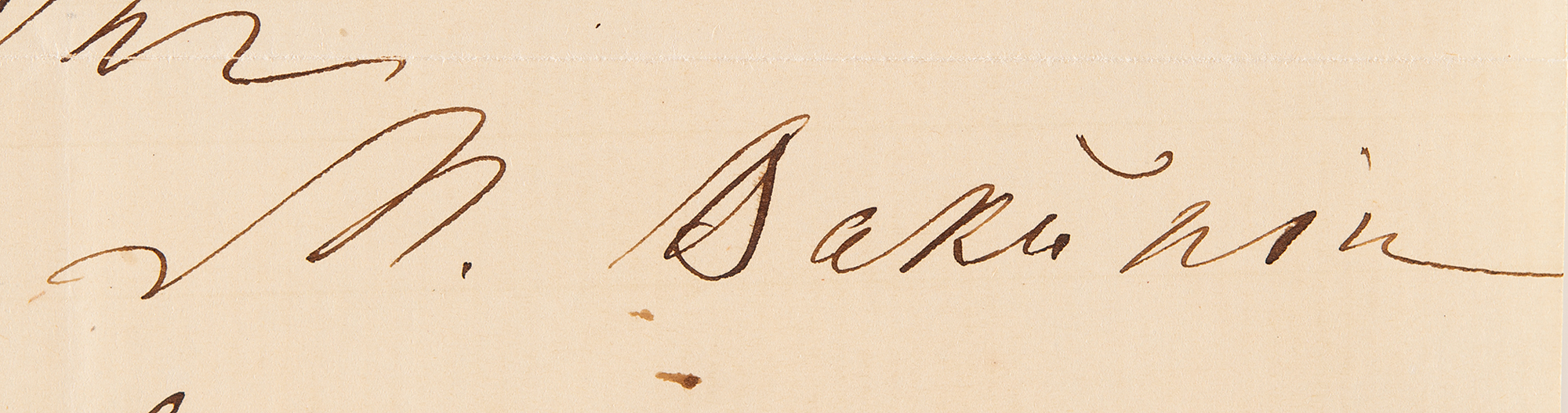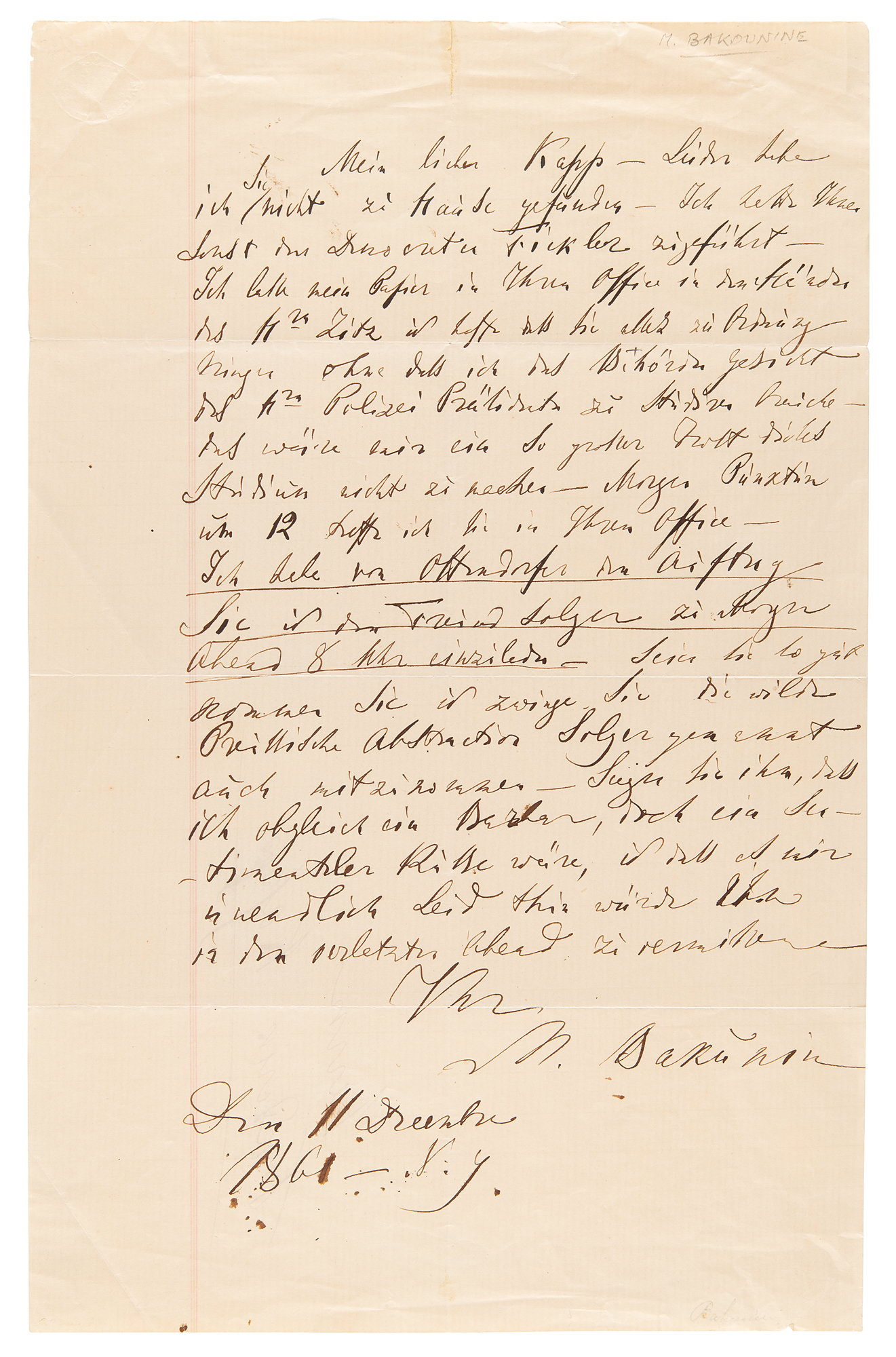Russian revolutionary who was a principal founder of the 'social anarchist' tradition (1814–1876). ALS in German, signed “M. Bakunin,” one page, 8 x 12.25, December 11, 1861. Handwritten letter to the political writer Friedrich Kapp, who had emigrated to the United States in 1850. In part (translated): "Unfortunately, I didn't find you at home—I would have introduced you to the democrat Fickler. I've left my papers at your office with Mr. Zitz, hoping everything will be in order without having to study the authorities’ faces." Addressed on the reverse in Bakunin's hand, "Herrn Frederik Kapp." In very good to fine condition, with light creasing, primarily to the top blank area, and a small edge separation repaired with tape on the reverse. Bakunin, sentenced to lifelong exile, had recently escaped from Siberia to America via Japan, and writes to Kapp a few days before his departure for England.