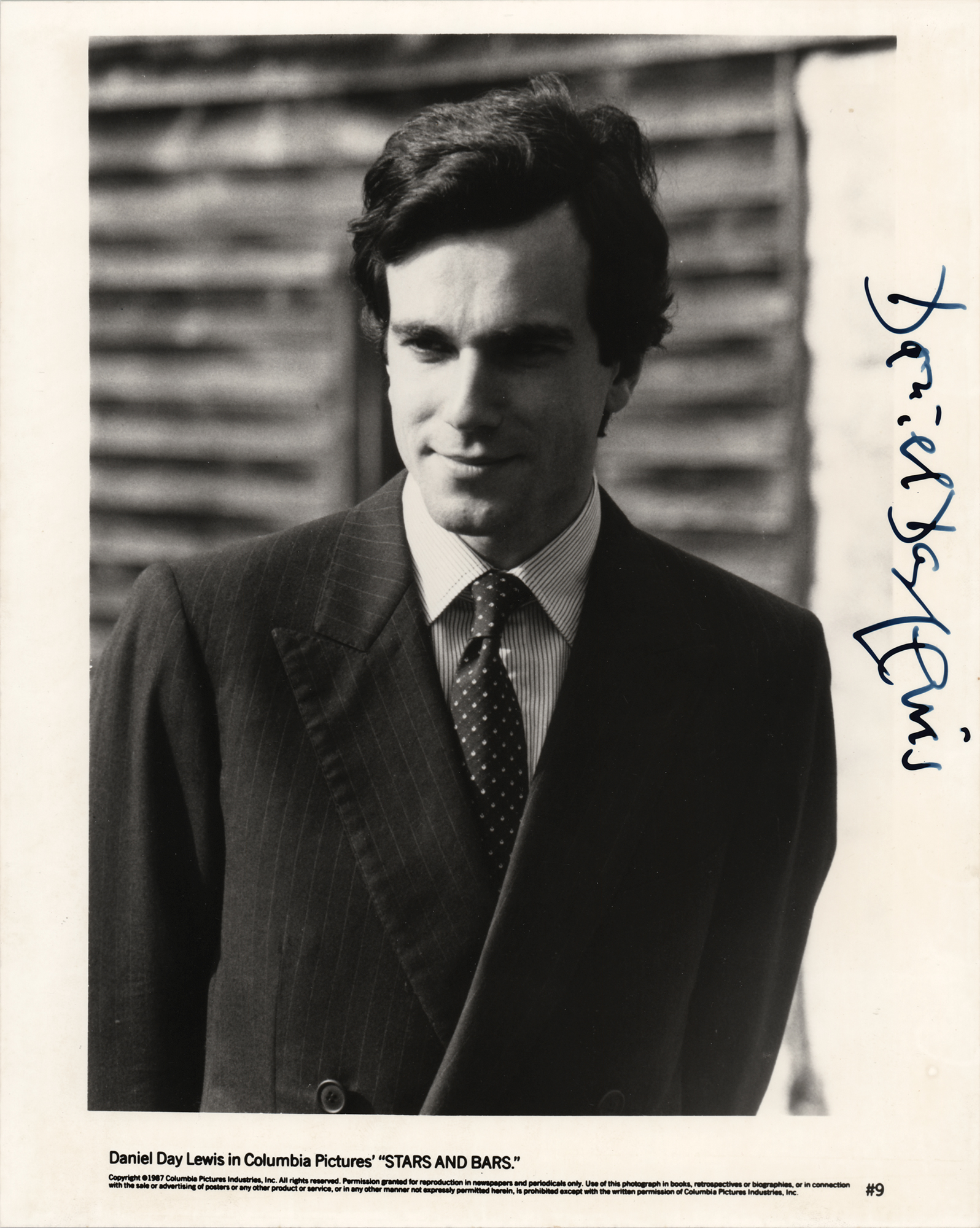 Glossy 8 x 10 Columbia Pictures publicity photo of Daniel Day Lewis in the 1988 comedy Stars and Bars, signed vertically in fountain pen. In very fine condition.
