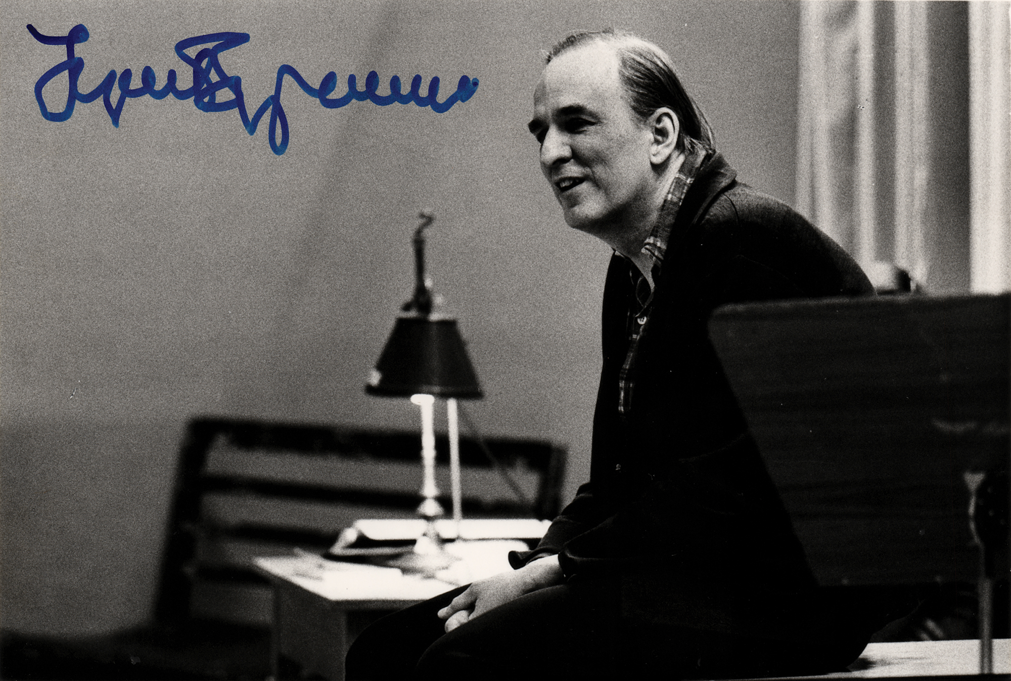 Swedish film and theatre director (1918-2007) known for acclaimed works including The Seventh Seal, Wild Strawberries, and Persona. Glossy 8 x 5.5 photo of the great filmmaker seated with his hands in his lap, signed in blue felt tip by Ingmar Bergman. In fine condition.