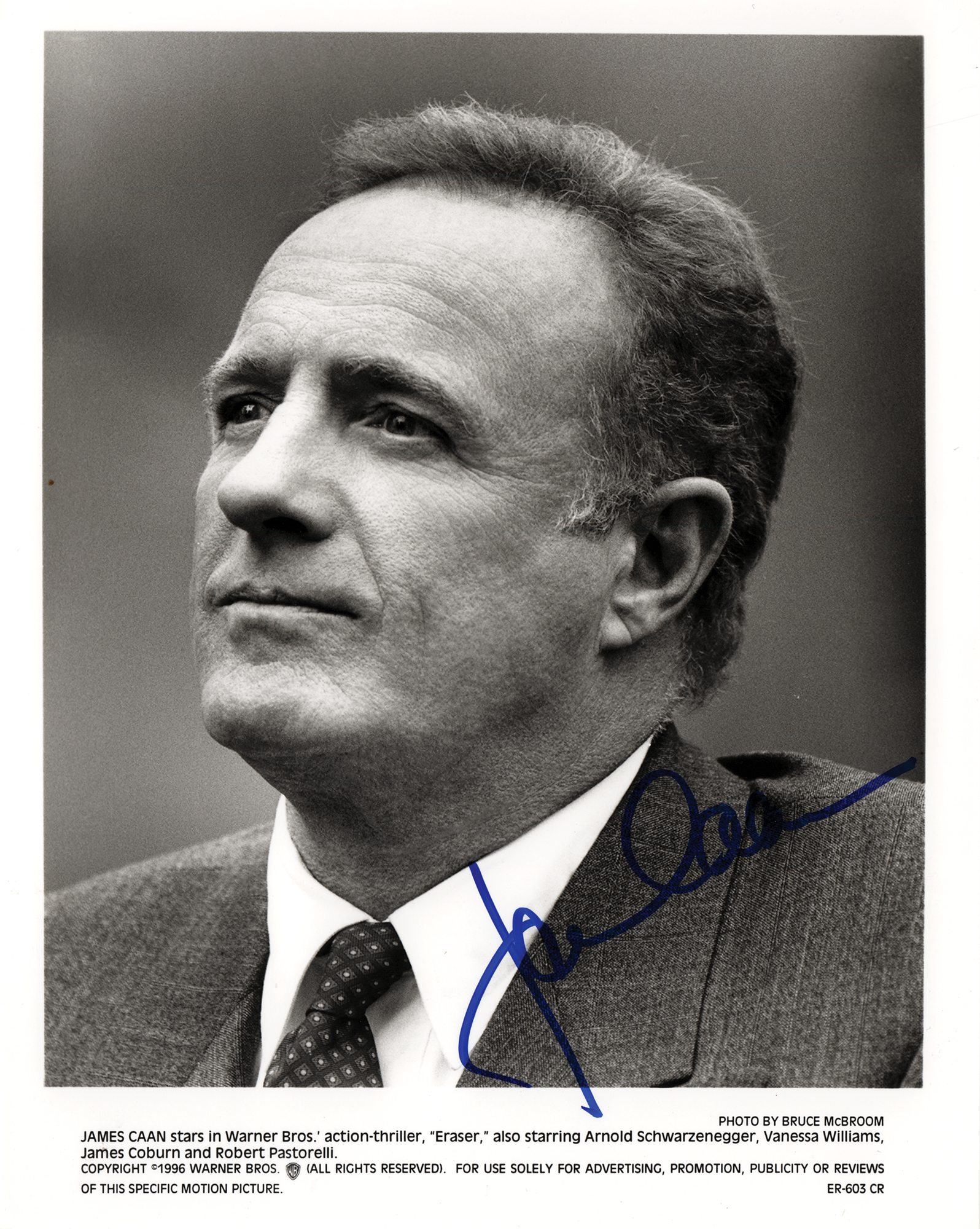 Glossy 8 x 10 Warner Bros. publicity photo of Robert DeGuerin in the 1996 action thriller Eraser, signed in blue felt tip by James Caan. In very fine condition.