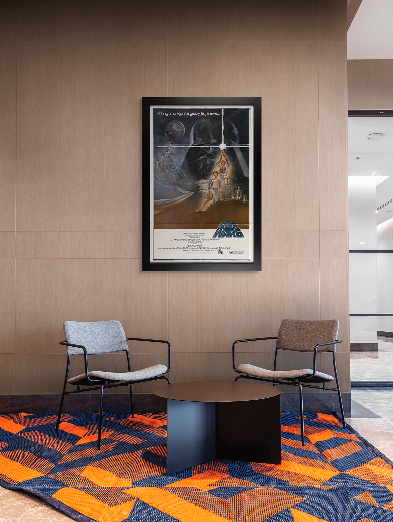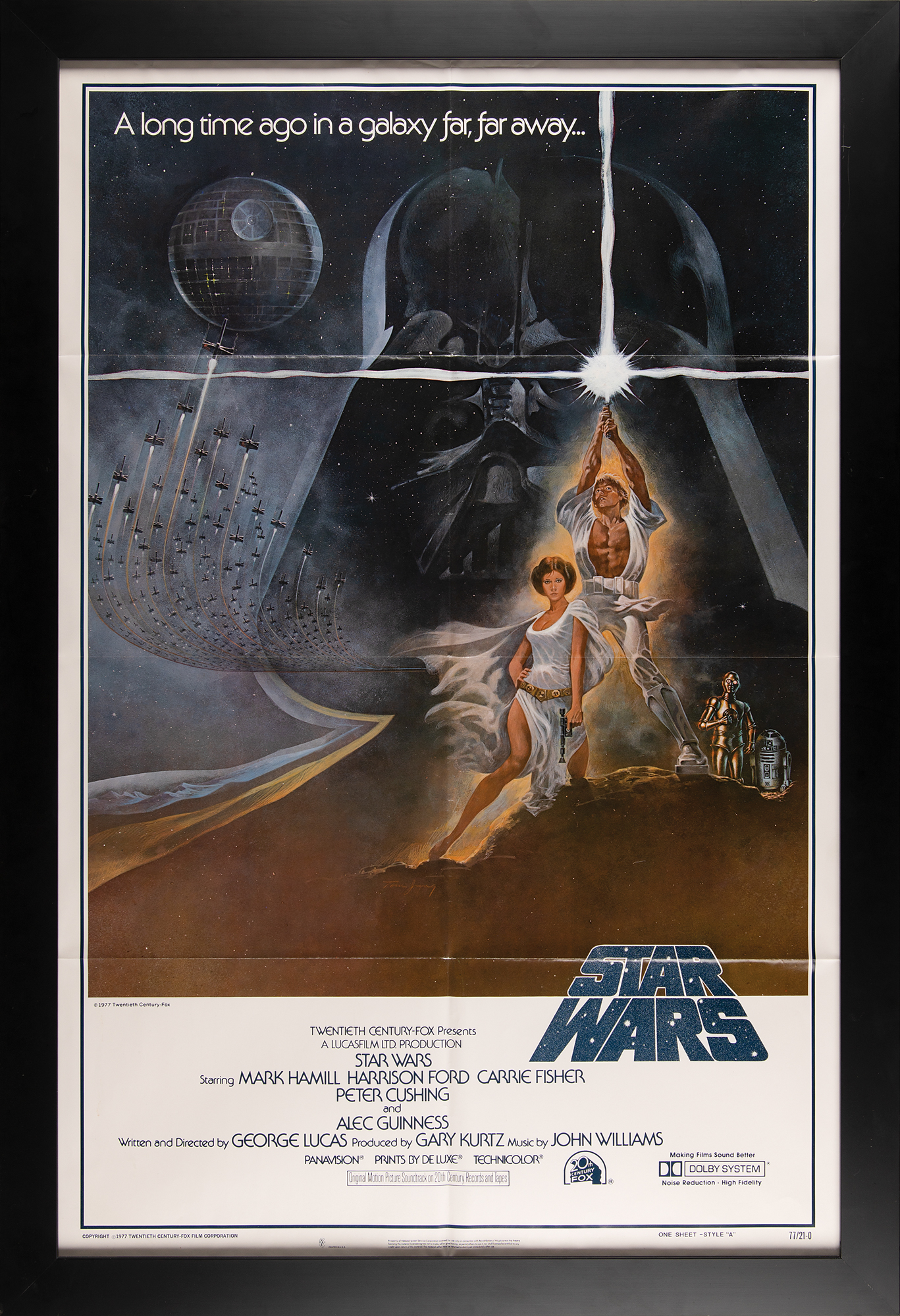 (20th Century Fox, 1977) Original first printing color 27 x 41 'Style A' one sheet poster for the 1977 space opera Star Wars, which features Tom Jung's classic artwork of Luke Skywalker, Princess Leia, and R2-D2 and C-3PO against a background of Darth Vader, the Death Star, and a fleet of starships. White text to upper section reads: "A long time ago in a galaxy far, far away…" Lower portion bears the film's logo, credits, and production details, with bottom border featuring NSS information and “One Sheet—Style ‘A,’ 77/21-0," identifying it as the first printing. Nicely framed to an overall size of 30.5 x 44.5. In fine condition, with folds as issued.