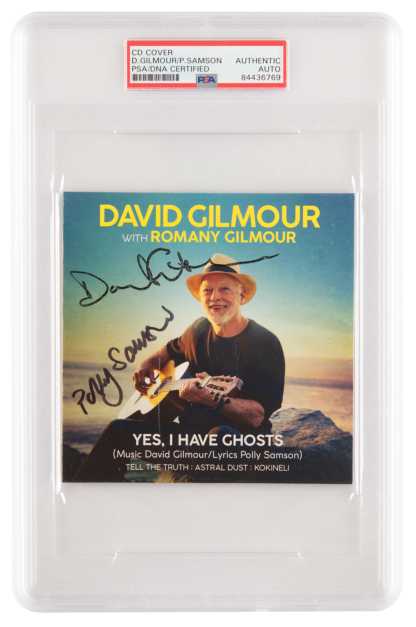 CD cover for Yes, I Have Ghosts, signed on the front in black felt tip by David Gilmour and songwriter Polly Samson. In fine condition. Encapsulated in a PSA/DNA authentication holder.