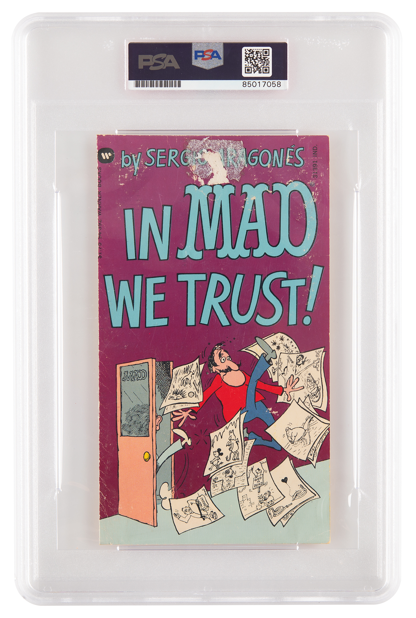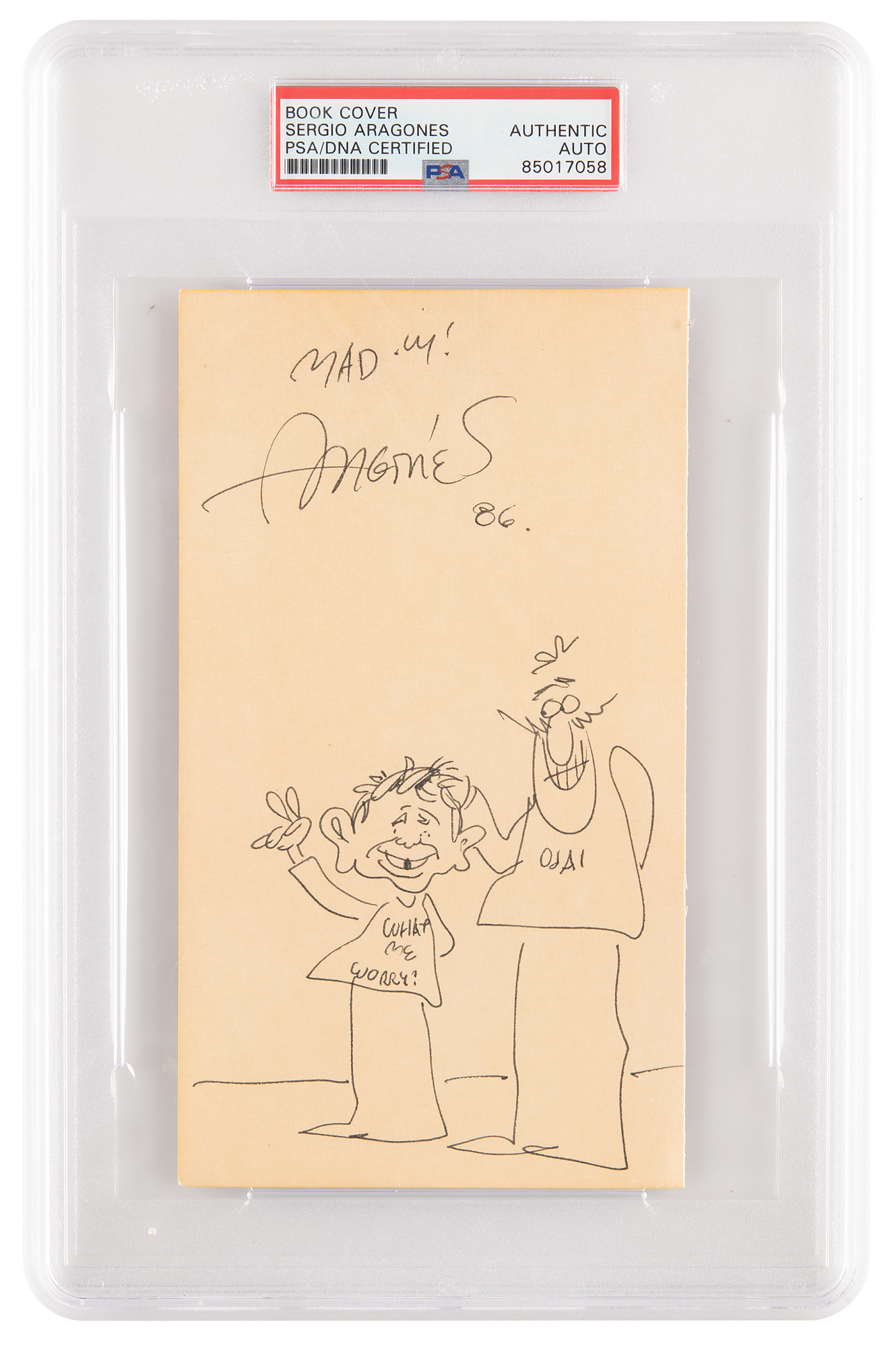 Spanish-born American cartoonist (born 1937) best known for his marginal gag illustrations sprinkled throughout the pages of MAD magazine. Original ink portrait of himself with MAD mascot Alfred E. Neuman, accomplished on the reverse of a 4 x 7 paperback book cover, signed in ink, "MAD-ly! Aragones, 86." In fine condition. Encapsulated in a PSA/DNA authentication holder.
