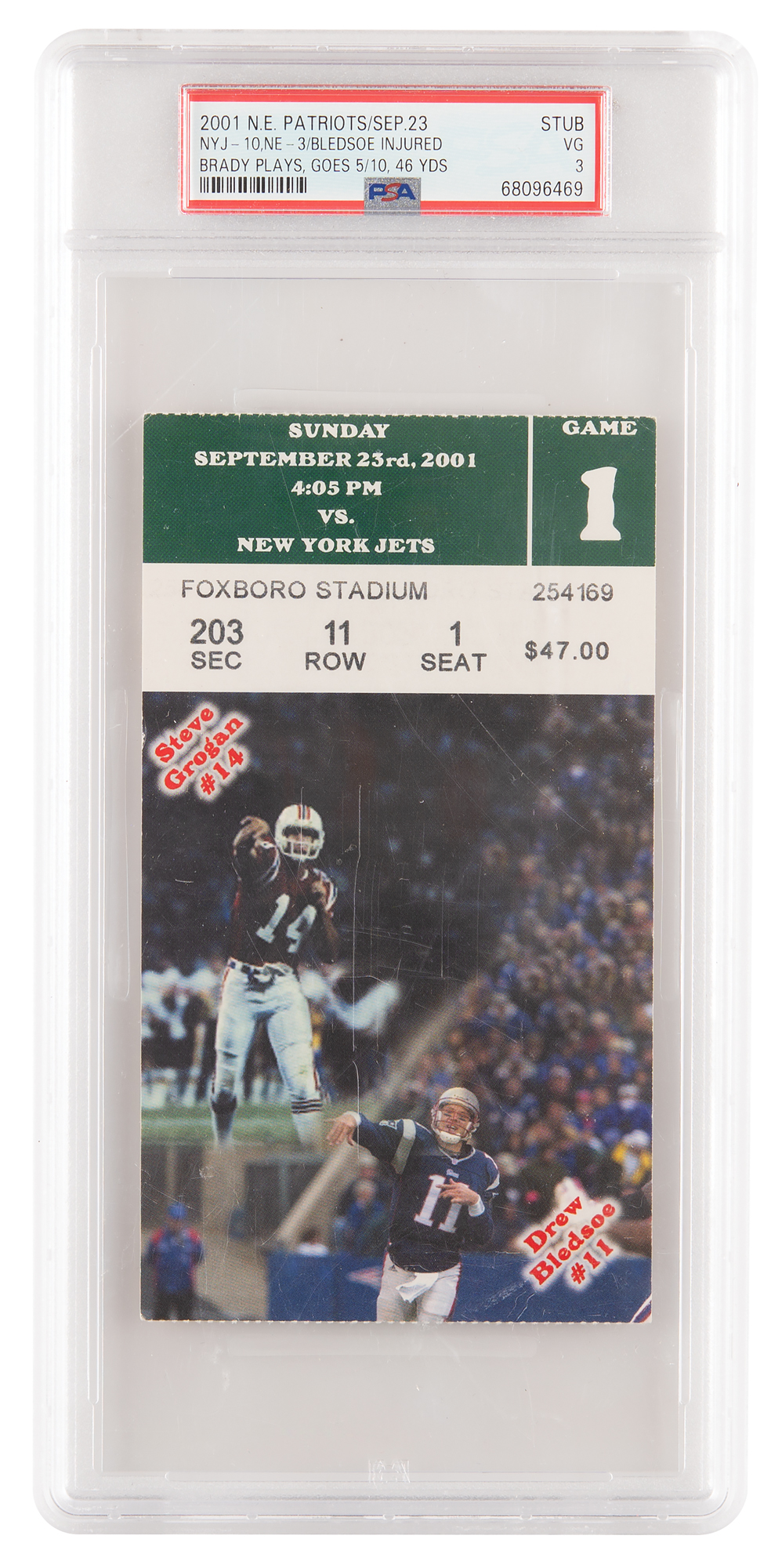 Tom Brady: Patriots vs. Jets NFL Ticket Stub (September 23, 2001) - Bledsoe Injured/Brady Plays - PSA VG 3