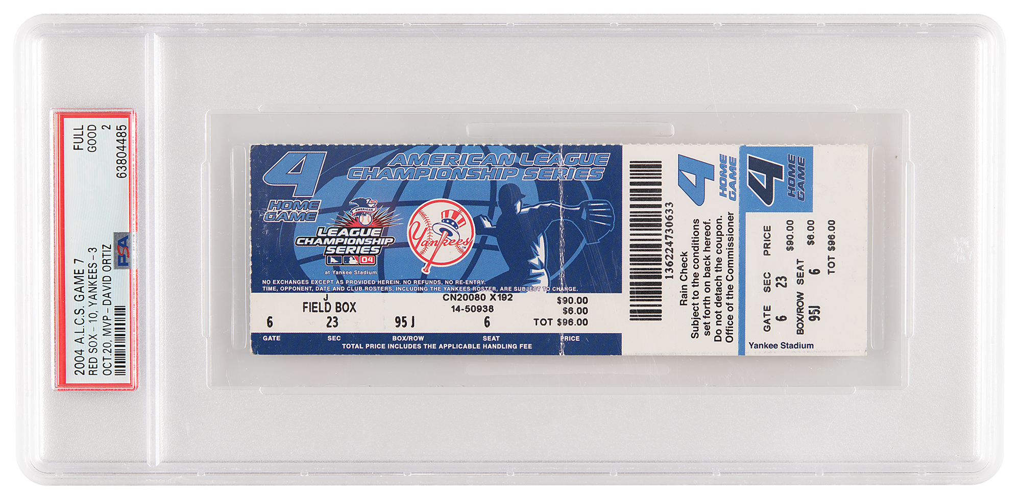 Full 6 x 2 ticket to the 2004 American League Championship Series Game 7 between the Boston Red Sox and New York Yankees, held at Yankee Stadium on October 20, 2004, marked as "Gate 6, Sec. 23, Box/Row 95J, Seat 6." With home runs from David Ortiz, Johnny Damon, and Mark Bellhorn, the Red Sox defeated the Yankees in dramatic fashion, winning 10-3. The Red Sox went on to sweep the St. Louis Cardinals in the World Series, winning their first championship in 86 years and ending the so-called 'Curse of the Bambino.' In good condition, with a crease at the center. Encapsulated and graded by PSA/DNA as "FULL GOOD 2."