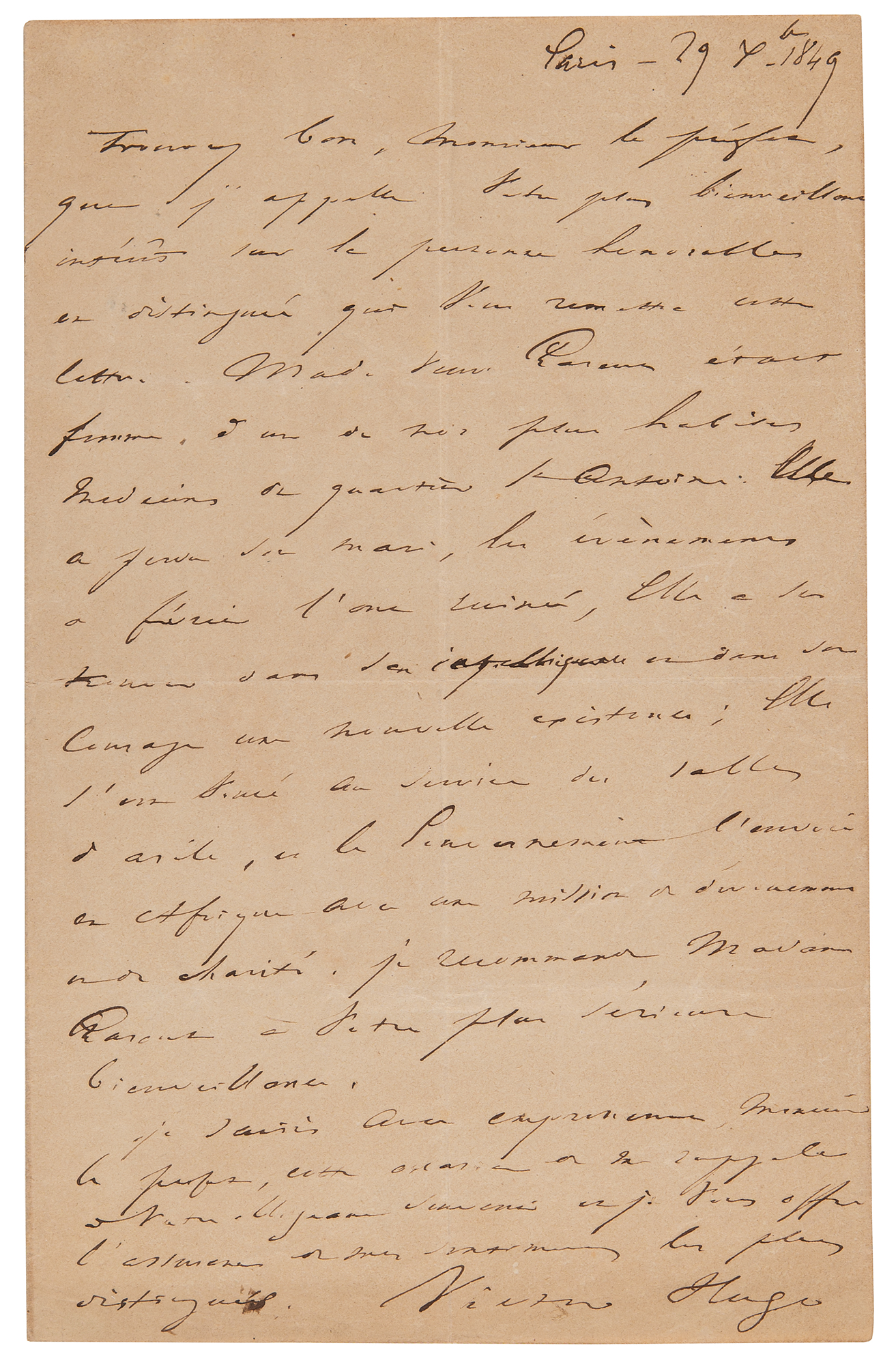 ALS in French, one page, 5.25 x 8.25, December 29, 1849. Handwritten letter to a prefect, in full (translated): "Please find good, Mr. Prefect, that I draw your most benevolent attention to the honorable and distinguished person who will give you this letter. Madame widow Parent was the wife of one of our most able doctors in the Saint Antoine district. She lost her husband, the events of February ruined her, she was able to find a new life thanks to her intelligence and courage. She dedicated herself to the service of asylum rooms, and the government is sending her to Africa with a mission of dedication and charity. I recommend Madame Parent to your most serious kindness. I eagerly seize, Mr. Prefect, this opportunity to present myself once again to your obliging memory and I offer you the assurance of my most distinguished feelings." In fine condition.