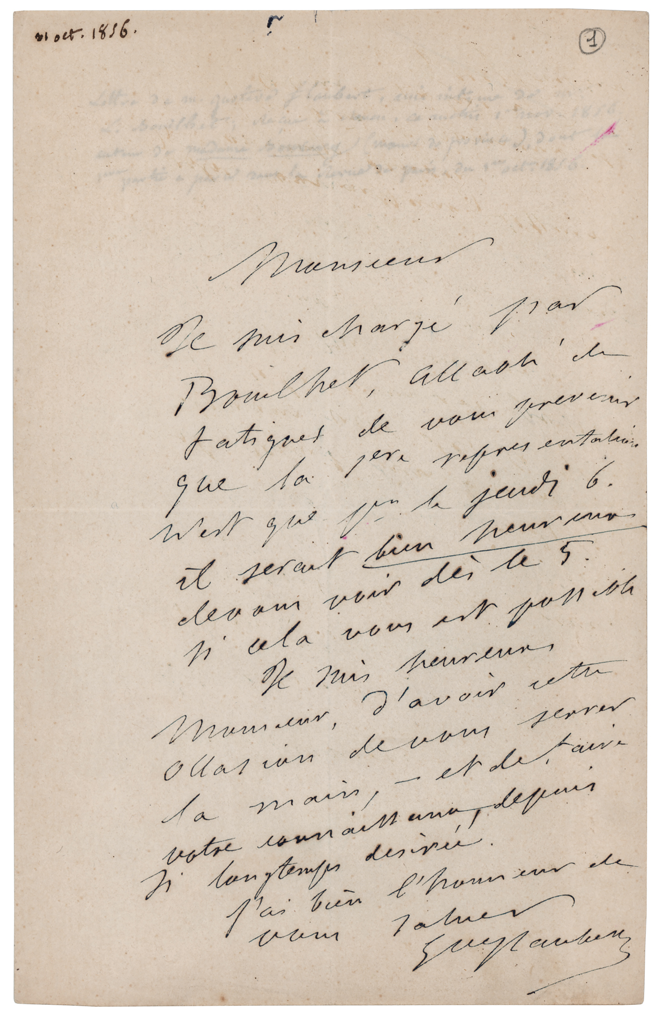 Celebrated French novelist (1821-1880) best known for his classics Madame Bovary, Salammbo, and A Sentimental Education. ALS in French, signed “Gve. Flaubert,” one page, 5.25 x 8.25, dated October 31, 1856 by the recipient. Handwritten letter to his friend Jean Clogenson, sent prior to the premiere of Louis Bouilhet's first play, Madame de Montarcy, at the Odéon on November 6th. In part (translated): "I have been asked by Bouilhet, overwhelmed with fatigue, to warn you that the first performance is only on Thursday the 6th. He would be very happy to see you on the 5th, if that is possible. I am happy, Sir, to have this opportunity to shake your hand—and to make your acquaintance, so long desired." Annotated by Clogenson with the date at upper left, as well as a brief description on the second integral leaf. In fine condition.