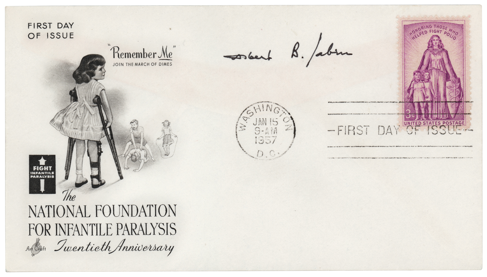 American medical researcher (1906–1993) best known for developing a practical oral polio vaccine. FDC with a cachet honoring the 20th anniversary of the National Foundation for Infantile Paralysis, signed in black felt tip, "Albert B. Sabin." In very fine condition.