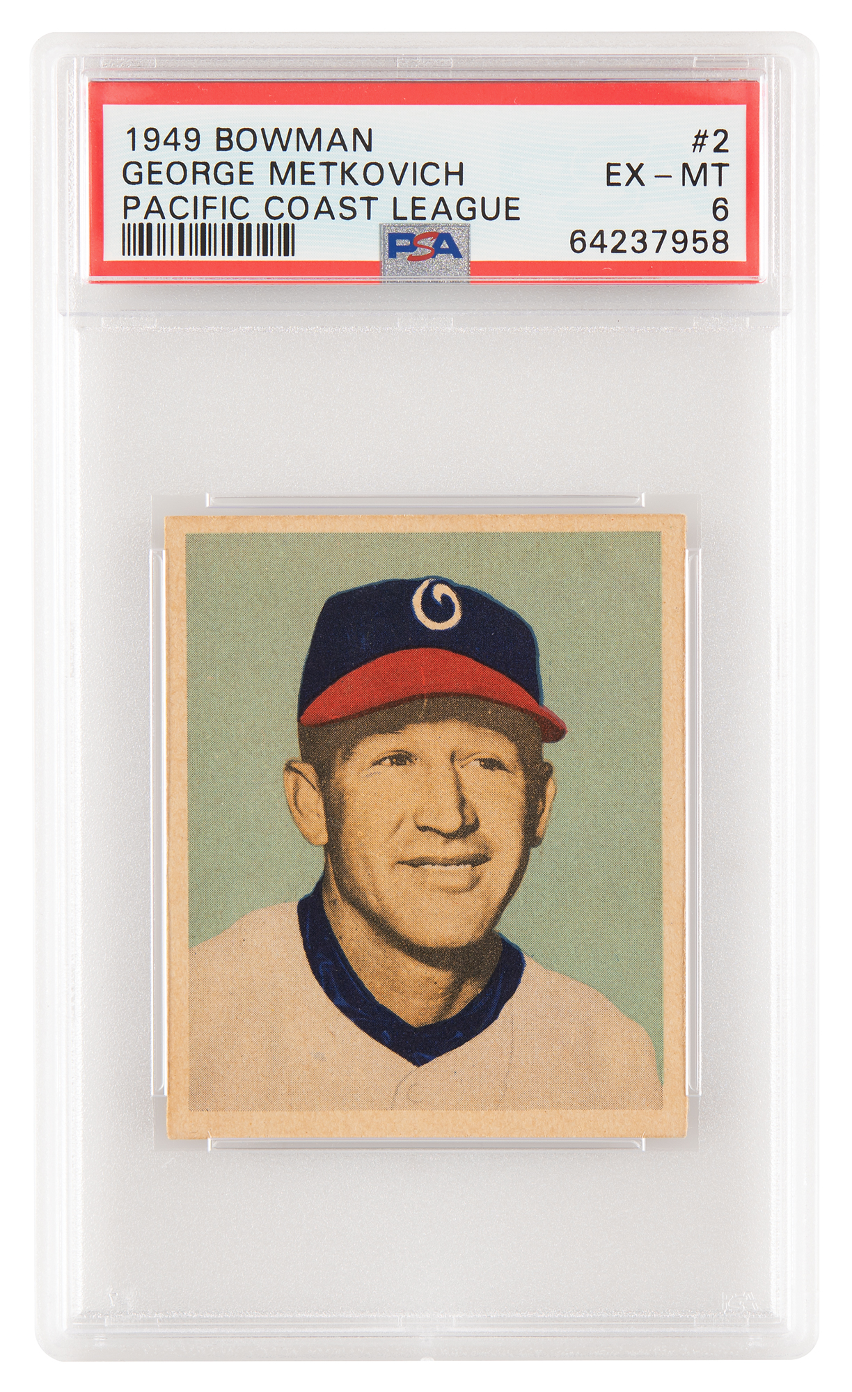 Graded by PSA EX-MT 6. Desirable mid-grade card from a scarce set, featuring a nice portrait of outfielder Catfish Metkovich in his Oakland Oaks baseball cap. In 2013, Metkovich was inducted posthumously in the Pacific Coast League Hall of Fame.