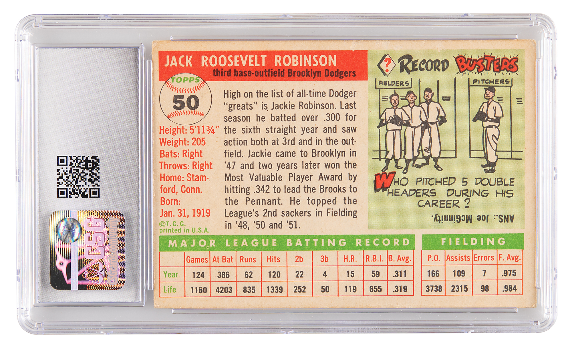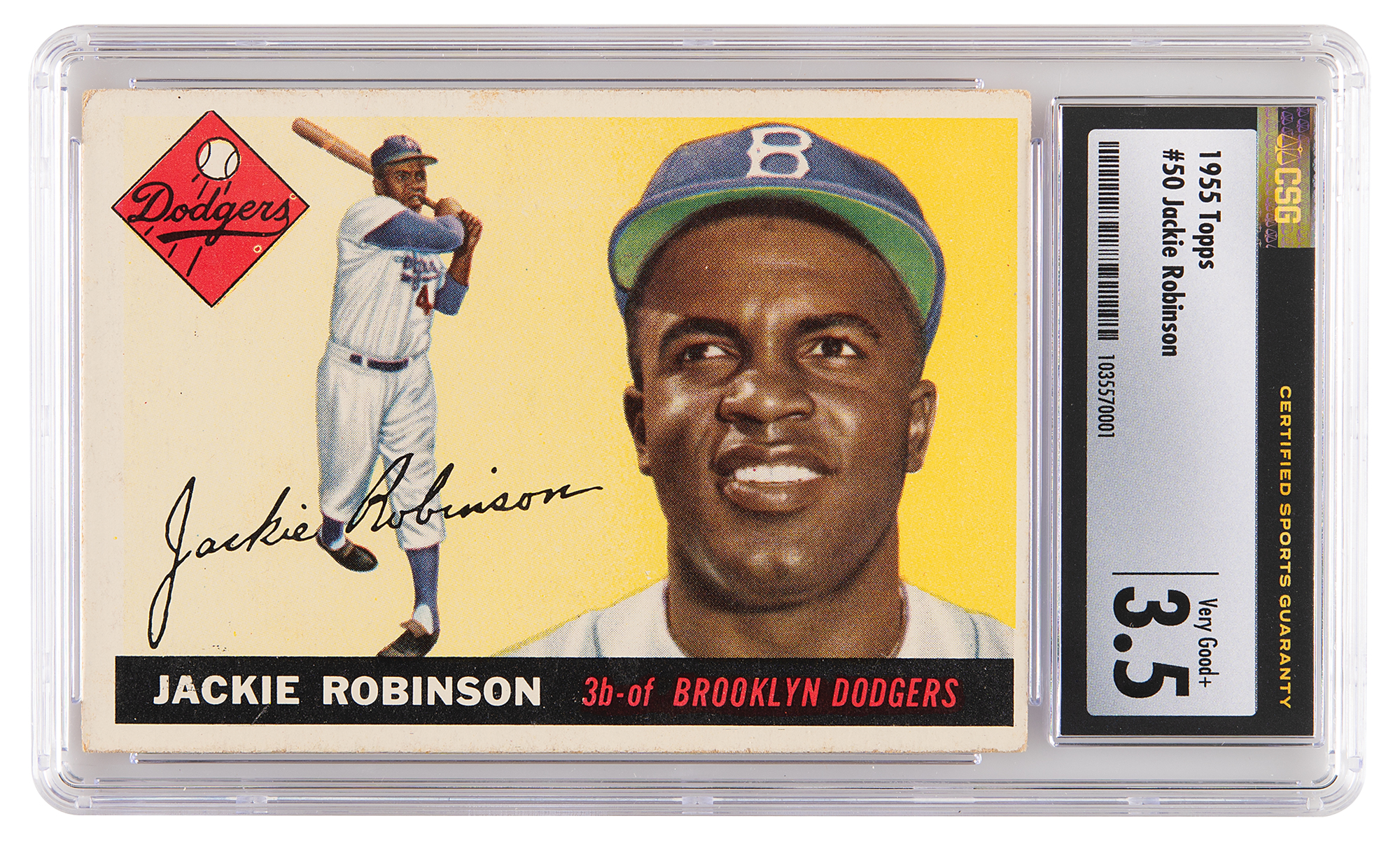 Graded by CSG VG+ 3.5. Jackie Robinson's penultimate regular-issue Topps card, featuring an outstanding close-up portrait of Robinson in his Brooklyn Dodgers cap on the right, and a dramatic illustration of him taking a swing on the left, along with his facsimile signature.