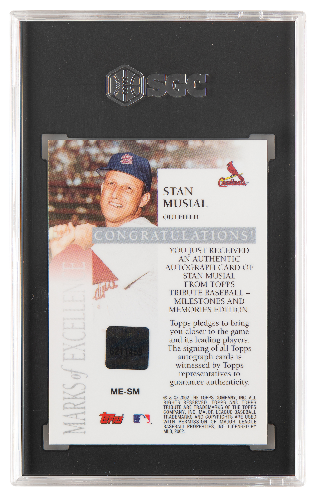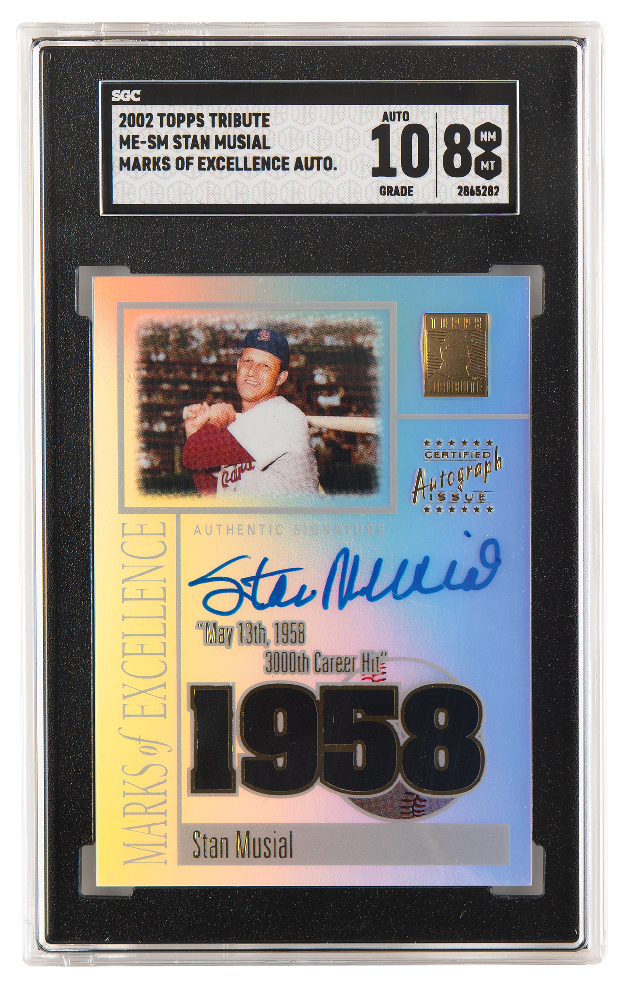 Graded by SGC NM-MT 8/AUTO 10. Fantastic Topps Tribute baseball card honoring Stan Musial's 3000th career hit, nicely signed in blue felt tip by the St. Louis Cardinals legend.