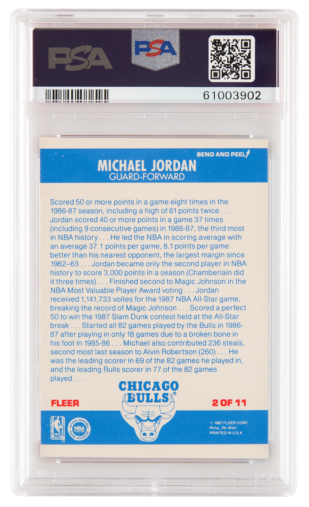 Graded by PSA EX-MT 6. A desirable example of Michael Jordan's second-year sticker, featuring sharp corners, clean edges, and bright colors in Fleer's classic red, white, and blue motif.