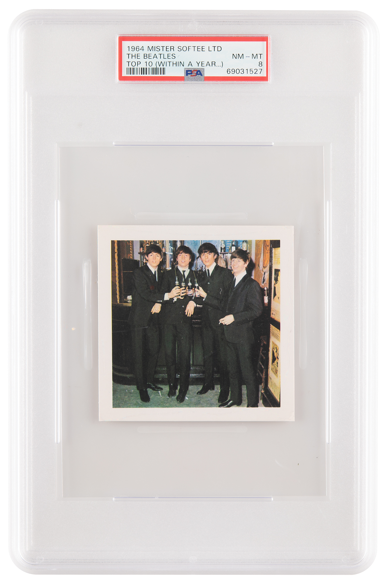 Graded by PSA NM-MT 8. Classic card from the 'Mister Softee Top 10' series presented by the Record Mirror, featuring a color image of the Beatles—John Lennon, Paul McCartney, George Harrison, and Ringo Starr—toasting to their success. Text on the reverse reads, in part: "Within a year of hitting the top of the charts the Beatles had appeared on the coveted Royal Variety Performance, starred on 'Sunday Night at the London Palladium,' been inundated with film offers, and been featured on several top television shows, including several of their own…They have visited America, the Continent and are destined to conquer the rest of the world. There have even been questions raised in Parliament about the Beatles. Nor are the boys too worried about the future. They have had their fun, made good money and delighted thousands of people. Their intelligence will see them through in the future."