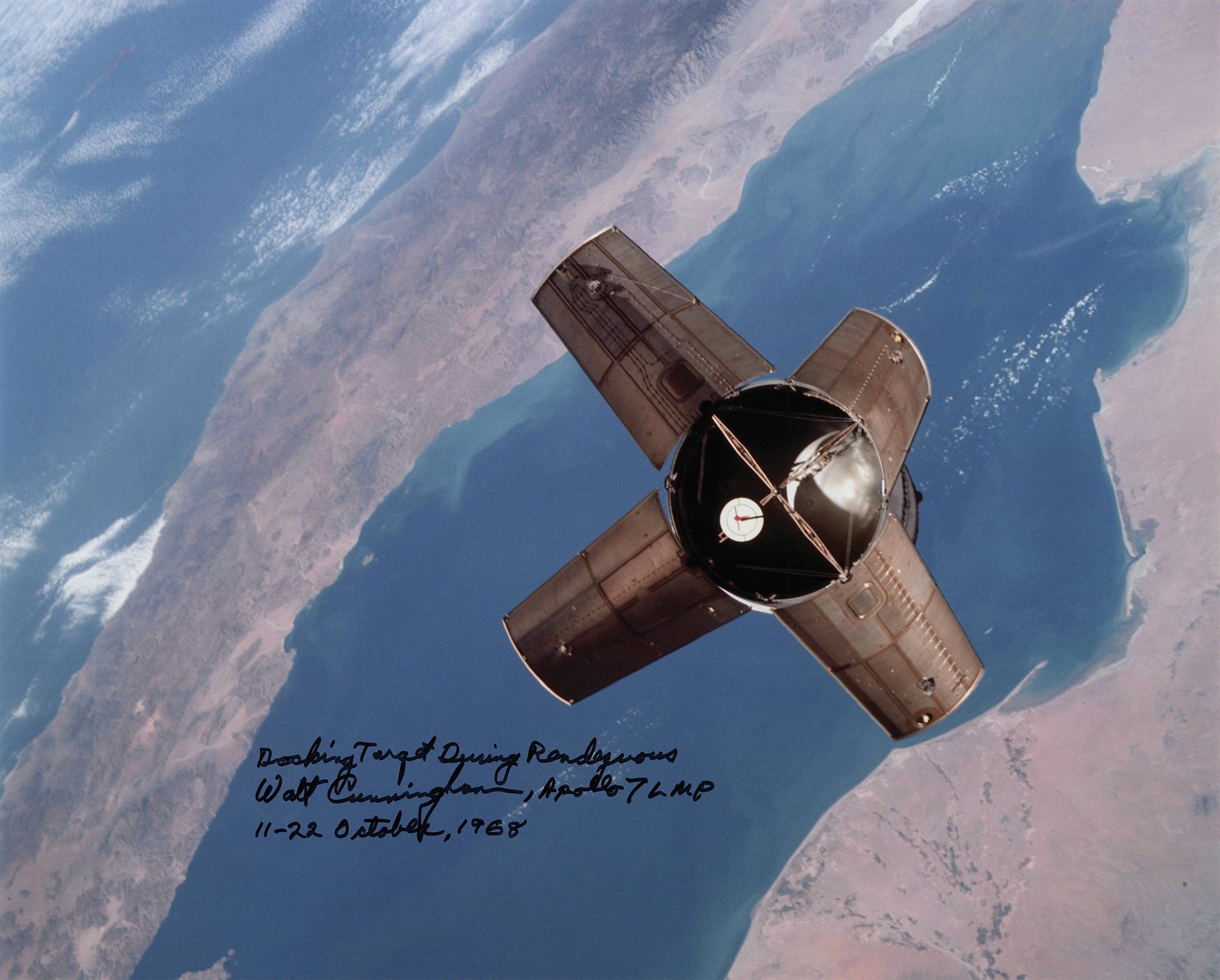 Color glossy 20 x 16 photo of the S-IVB docking target taken during the Apollo 7 mission, signed in black felt tip, "Docking Target During Rendezvous, Walt Cunningham, Apollo 7 LMP, 11–22 October, 1968." In very fine condition.