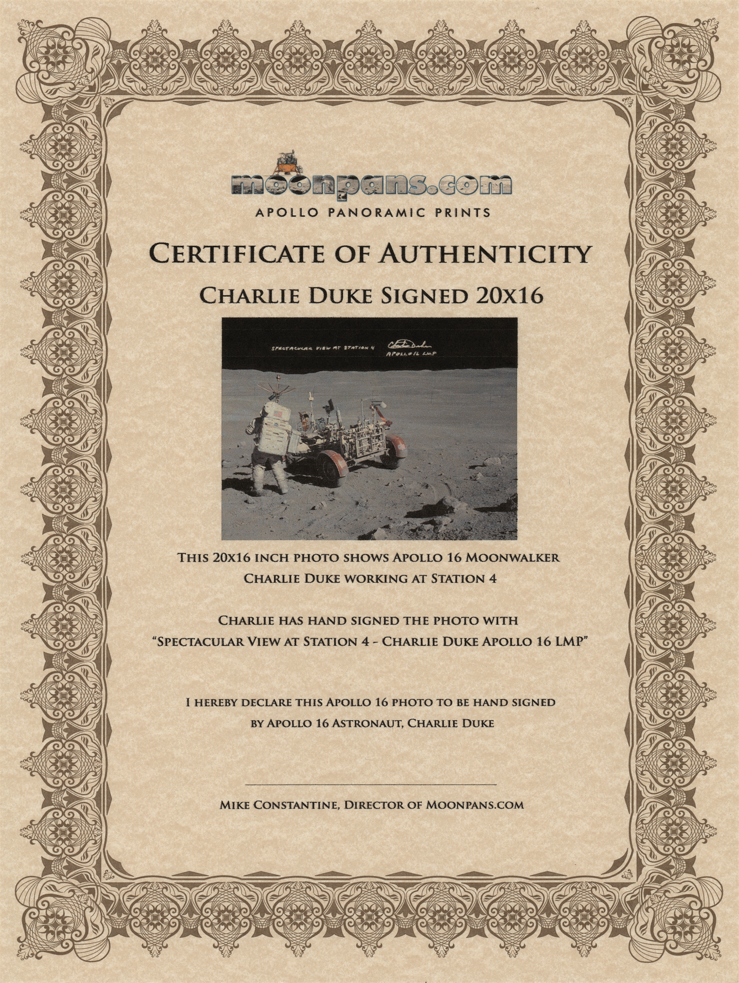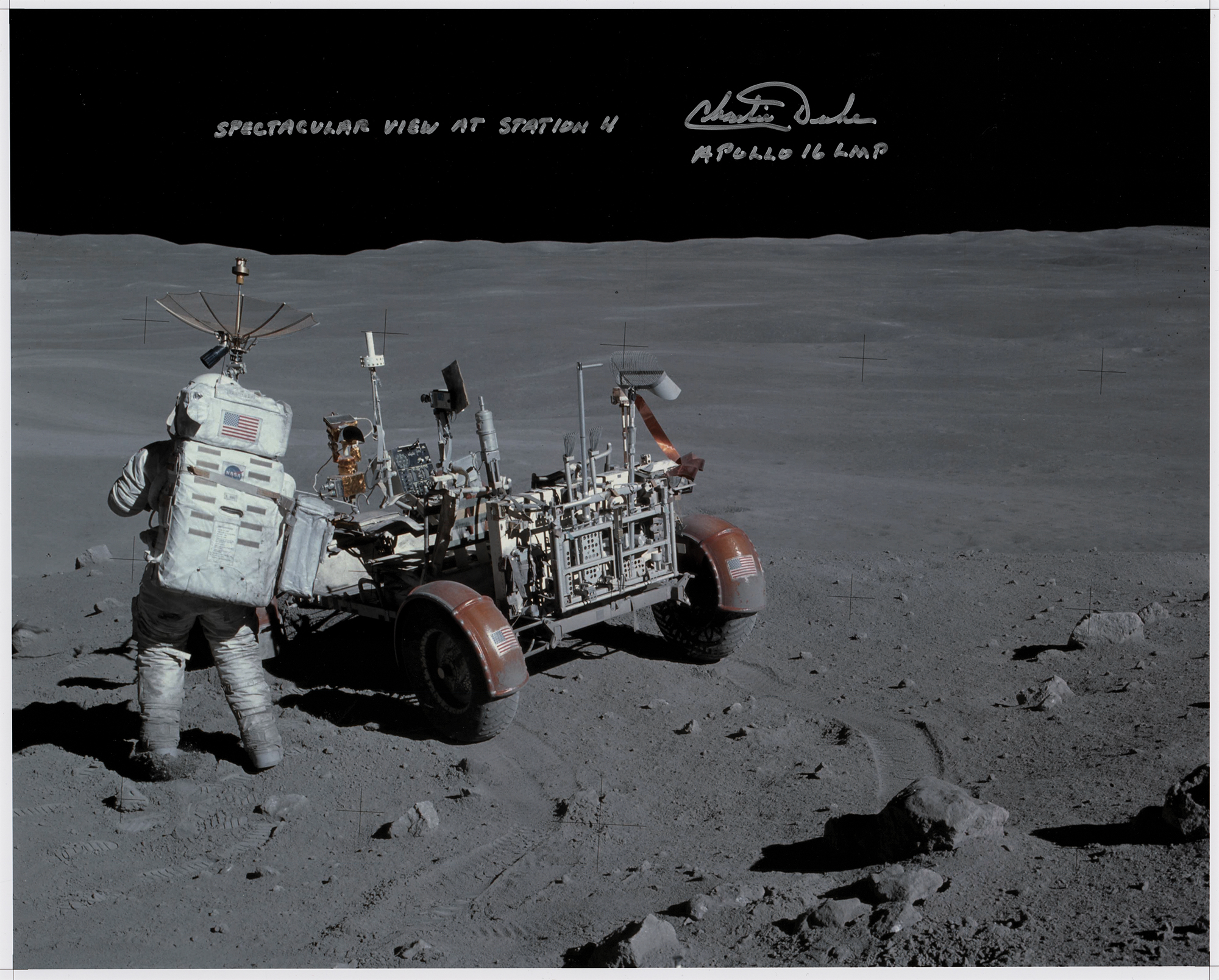 Color satin-finish 20 x 16 photo of Charlie Duke at work near the Lunar Roving Vehicle, signed in silver ink, "Spectacular view at Station 4, Charlie Duke, Apollo 16 LMP." In very good to fine condition, with scattered small surface creases.