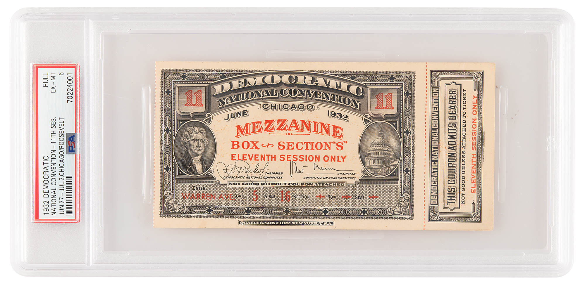 Unused ticket to the eleventh session of the Democratic National Convention in Chicago in June 1932, 5.75 x 2.75, for admission to the "Mezzanine." In fine condition. Encapsulated and graded by PSA as "FULL EX-MT 6."