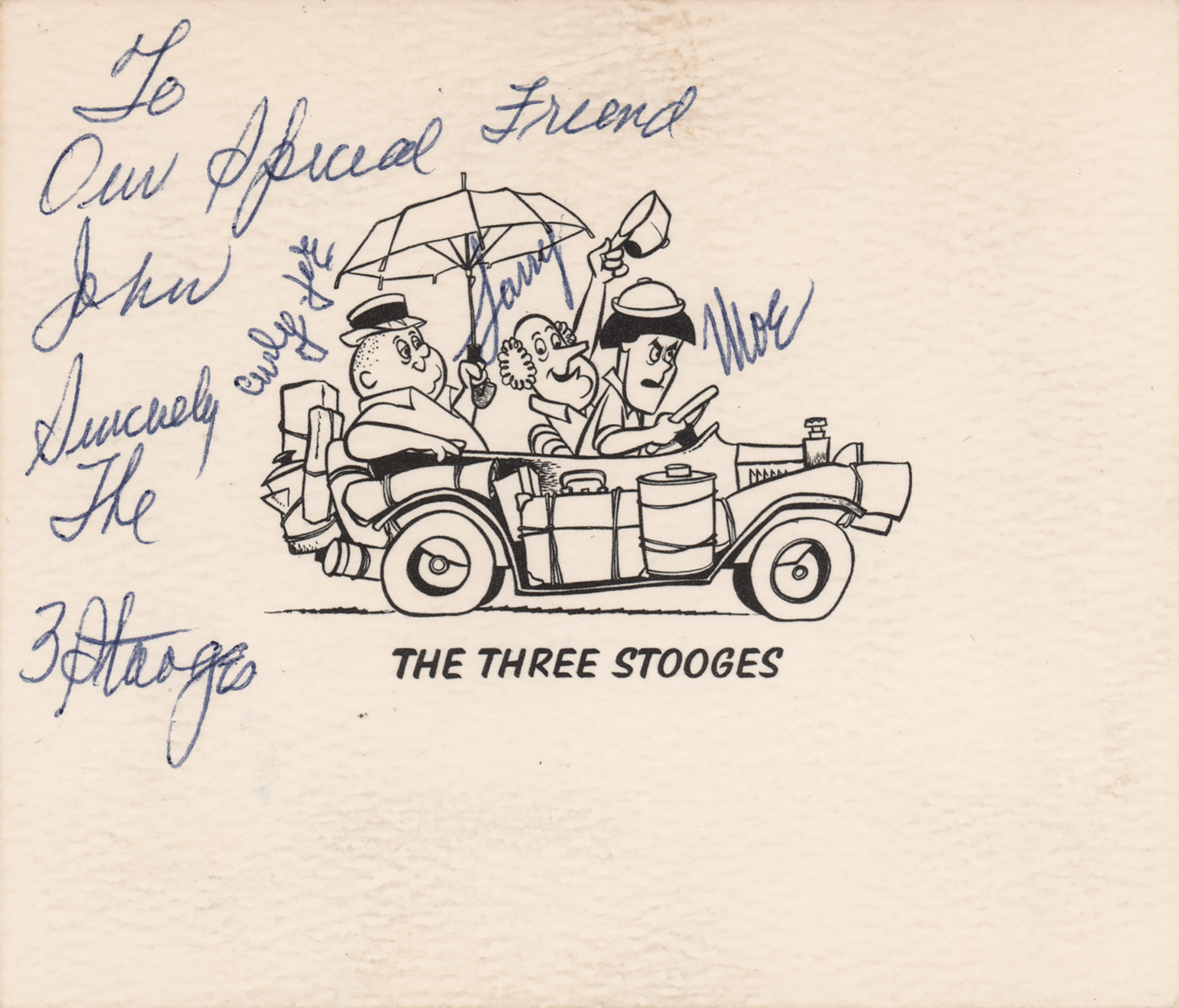 Ballpoint signatures and inscription, "To Our Special Friend, John, Sincerely The 3 Stooges, Moe," "Curly Joe," and "Larry,” on an off-white 5 x 4.25 Three Stooges card. In very fine condition.