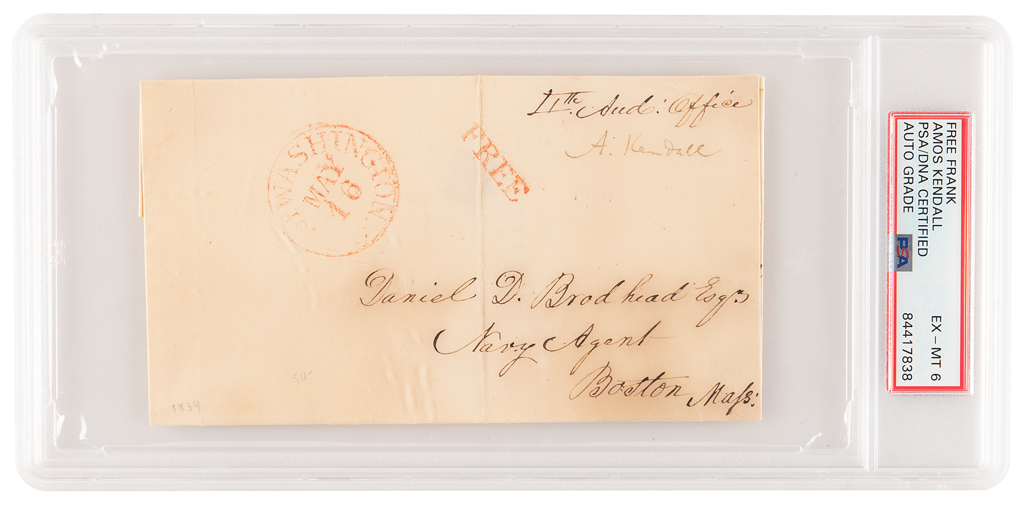 Lawyer, journalist, and politician (1789-1869) who served as postmaster general under Andrew Jackson and Martin Van Buren. Hand-addressed mailing cover, 6 x 3.25, filled out in another hand and postmarked at Washington, May 16 [1834], addressed to “Daniel D. Brodhead Esqr, Navy Agent, Boston, Mass,” and franked above, "A: Kendall.” In very good to fine condition, with irregular toning and a central vertical fold. Encapsulated and graded by PSA/DNA as "EX-MT 6."