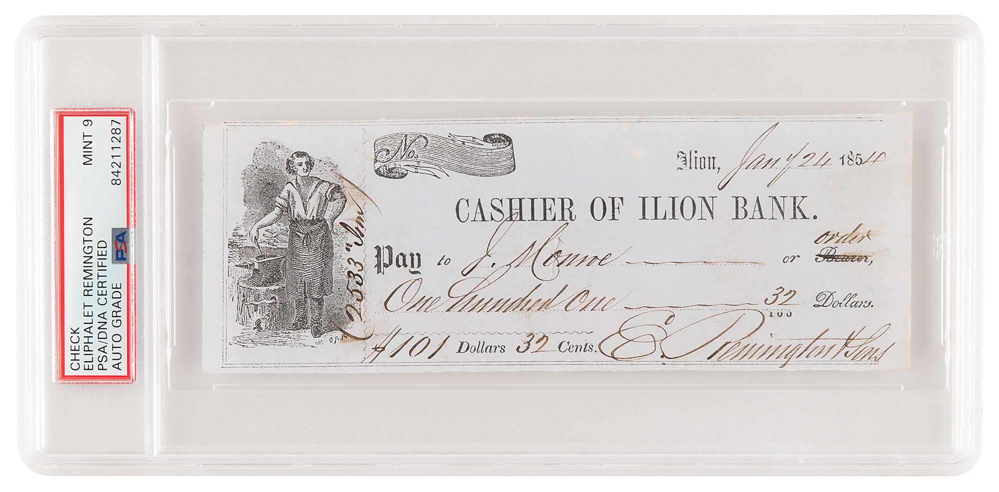 Nineteenth-century firearms manufacturer and son of the designer of the original Remington rifle (1793-1861). Cashier of Ilion Bank check, 7 x 2.5, filled out and signed by Remington, "E. Remington & Sons," payable to J. Monroe for $101.37, January 24, 1854. In fine condition. Encapsulated and graded by PSA/DNA as “MINT 9.”