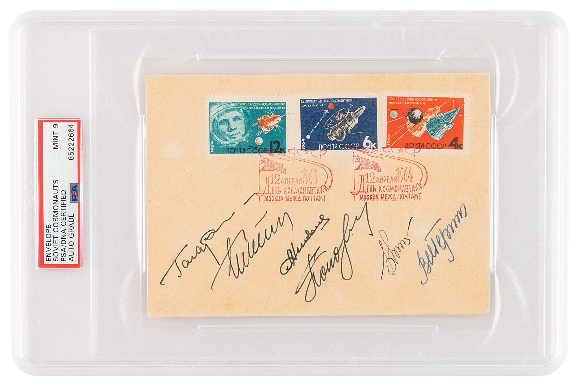 Commemorative cover honoring April 12th, Cosmonautics Day, featuring three affixed Soviet space stamps, signed in fountain pen by six pioneering cosmonauts: Yuri Gagarin, Gherman Titov, Andriyan Nikolayev, Pavel Popovich, Valery Bykovsky, and Valentina Tereshkova. In fine condition. Encapsulated and graded by PSA/DNA as “MINT 9.”