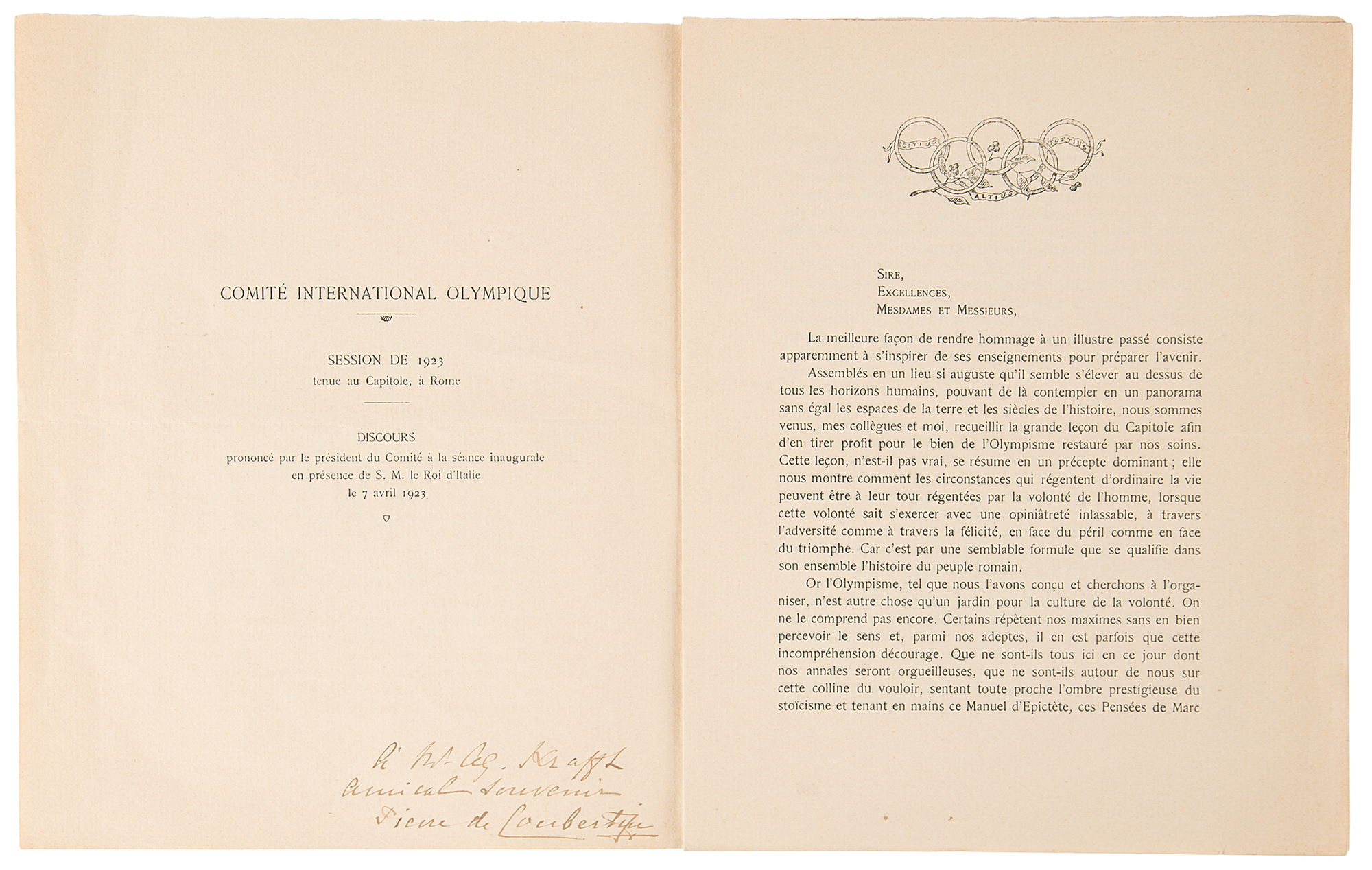 Scarce French-language booklet containing a printed speech made by International Olympic Committee President Pierre de Coubertin at the start of the 21st IOC Session held in Rome, Italy, from April 7-12, 1923, five pages, 7.75 x 9.75, signed and inscribed on the inside of the front cover in fountain pen by Pierre de Coubertin. In fine condition, with a horizontal fold, and partial separation to the lower hinge. Los Angeles was selected as the host for the Games of the X Olympiad at the 21st IOC Session.