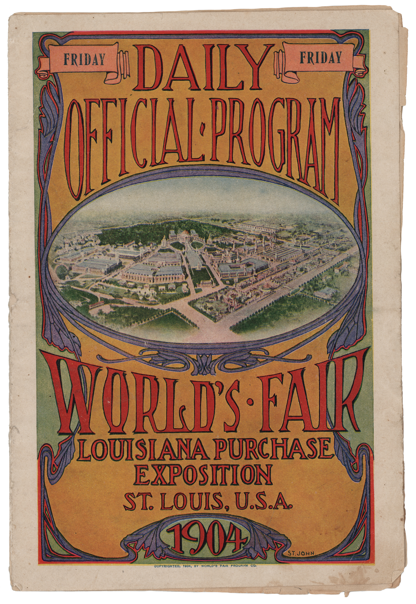Daily official program for the World's Fair or Louisiana Purchase Exposition in St. Louis on June 24, 1904, which played host to that year's Olympic Games, 16 pages, 6 x 9, providing schedules and descriptions of the day's diverse events, which includes: “Indian School, Band Concert,” “U.S. Life Savers Drill,” “Feeding hour for seals,” and “Swedish Day Parade.” On the final page, “Future Events,” a section marked “Olympic Games” lists the schedule for “College Baseball.” In very good condition, with the inner pages detached from binding, near complete separation to the spine, and scattered edgewear.