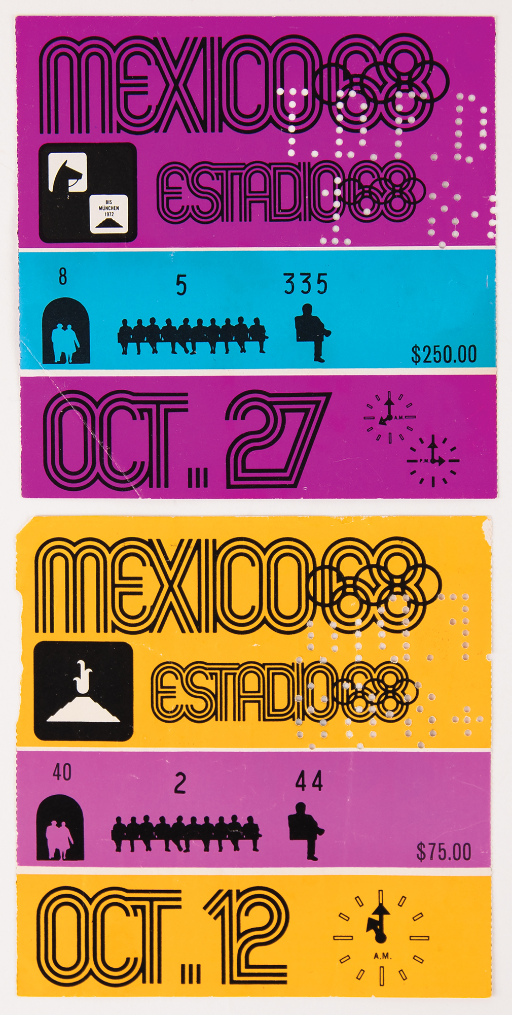 Official ticket stubs for the opening and closing ceremonies of the Mexico City 1968 Summer Olympics, both 4.5 x 4.5, with the yellow-and-purple opening ceremony stub dated October 12th, priced at $75, and featuring a pictogram of the torch lighting, and the purple-and-blue closing ceremony stub dated October 27th, priced at $250, and featuring pictograms representing the final day of the equestrian events and the Olympic summer transition to Munich in 1972. In overall fine condition, with light creases and punch holes.