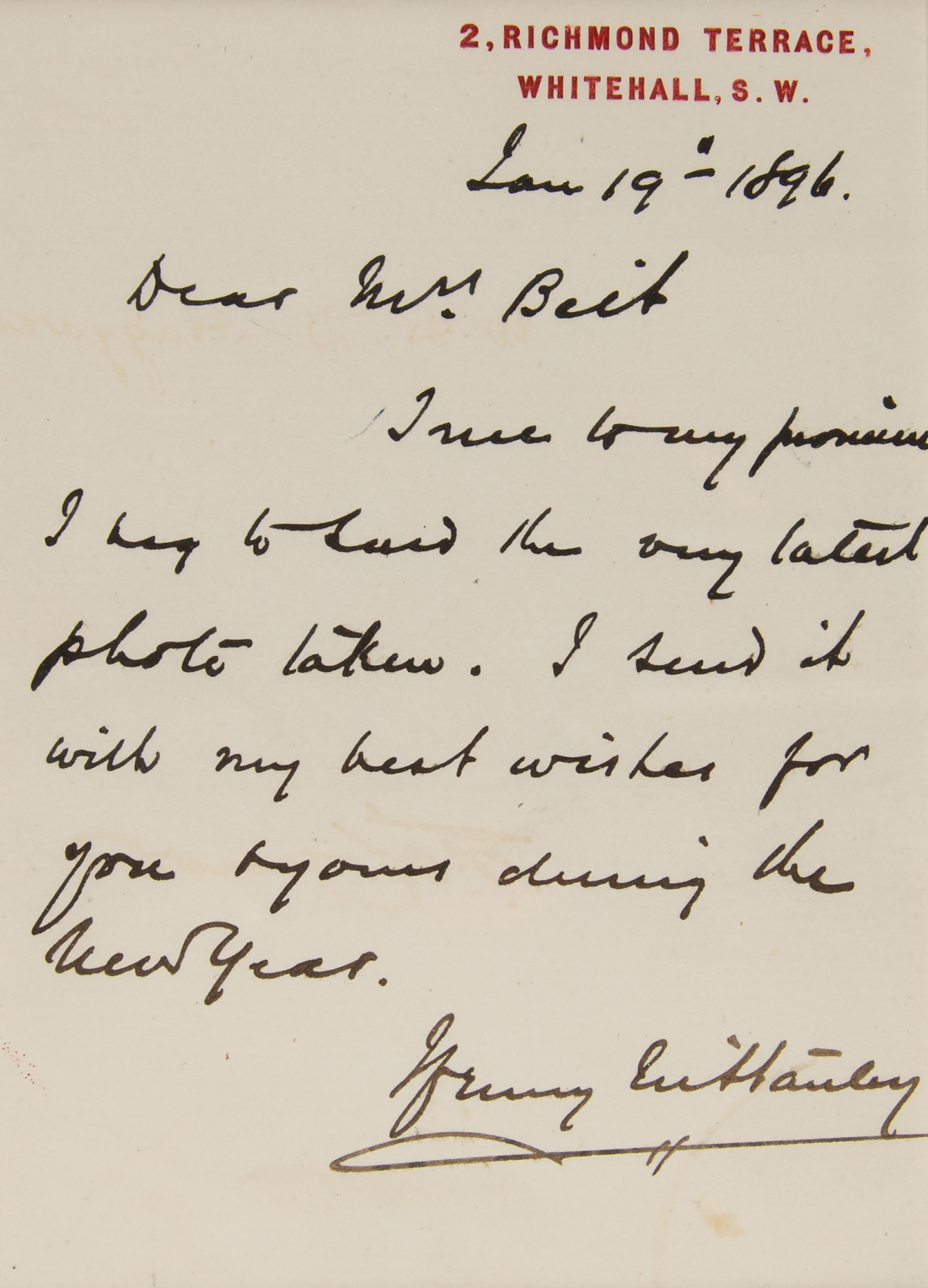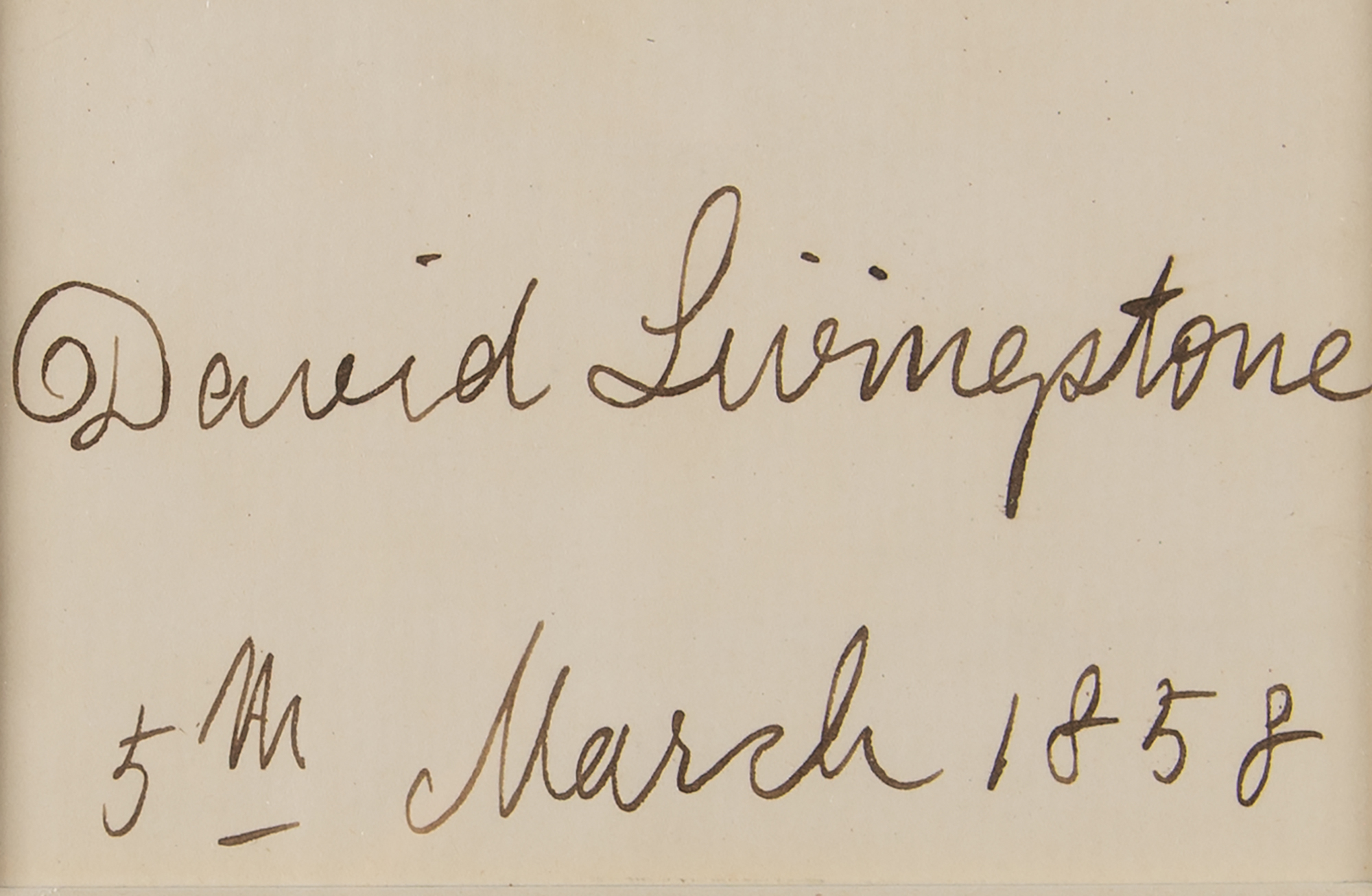 Two items: an ALS signed “Henry M. Stanley,” one page, 4 x 5.5, 2 Richmond Terrace letterhead, January 19, 1896, handwritten to Mrs. Beit, in full: “True to my promise I beg to send the very latest photo taken. I send it with my best wishes for you & yours during the New Year”; and a bold ink signature, “David Livingstone, 5th March 1858,” on an off-white 3.5 x 2.5 sheet. Both are matted and framed together with portraits and engraved plaques to an overall size of 16 x 22.5. In overall fine condition.