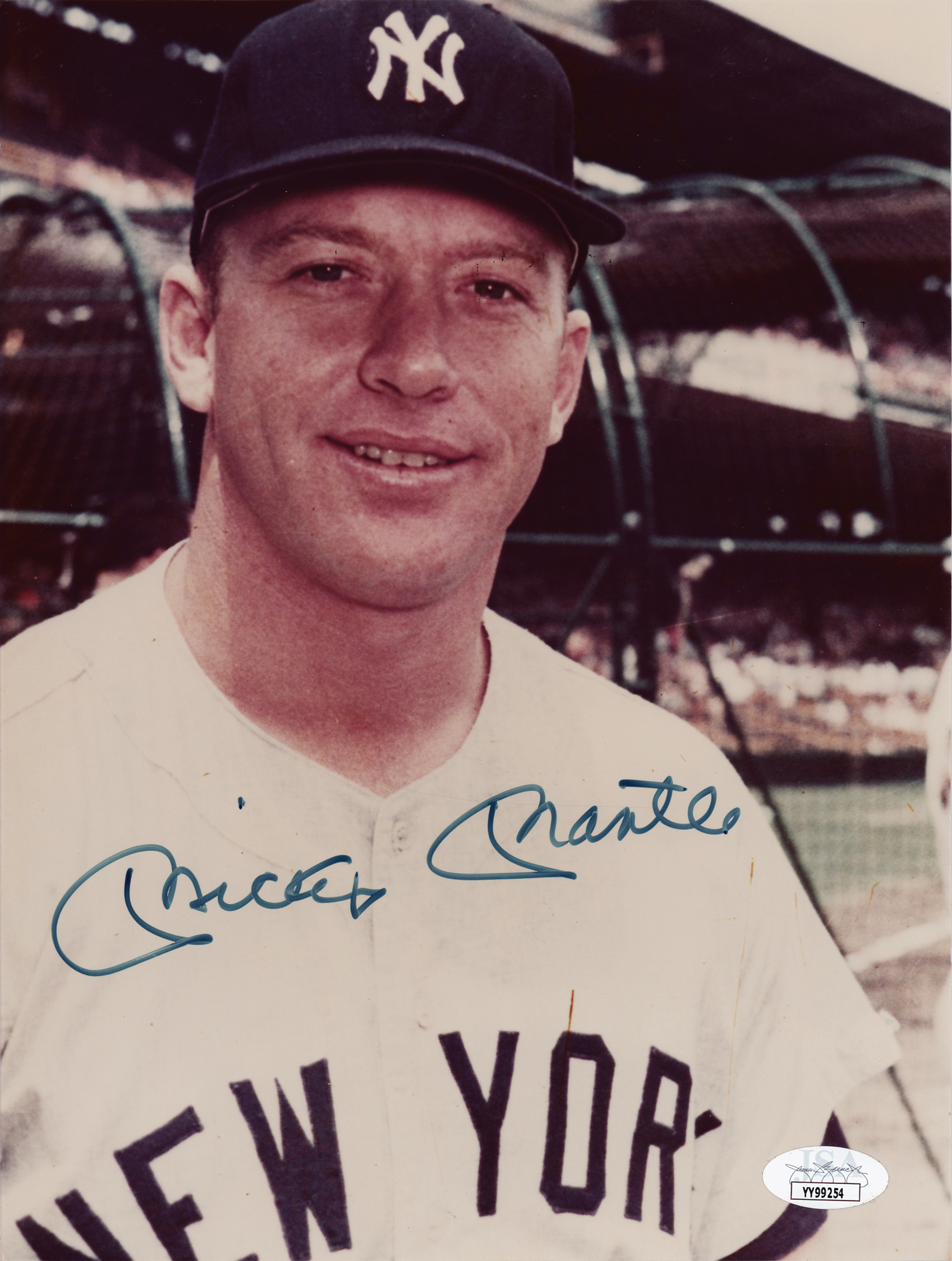 Outstanding color glossy 7.5 x 10 bust-length photo of Mickey Mantle in his New York Yankees uniform, prominently signed in black felt tip by the legendary ballplayer. In fine condition, with a JSA label affixed to the lower right corner. Accompanied by a full letter of authenticity from JSA.