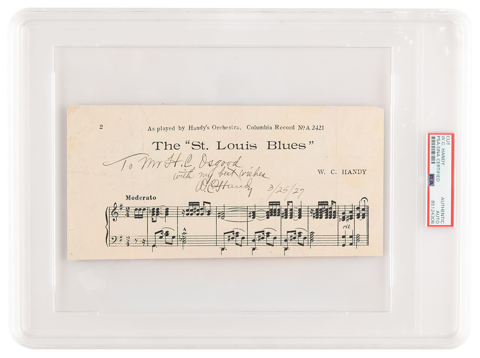 African-American musician and composer (1873–1958) who is known as the ‘Father of the Blues,’ and is remembered for songs like ‘Memphis Blues’ and ‘St. Louis Blues.’ Partial page from a vintage sheet music booklet for W. C. Handy's ‘The ‘St. Louis Blues,’’ 9 x 4.25, signed and inscribed in fountain pen, “To Mr. H. C. Osgood, with my best wishes, W. C. Handy, 3/25/27.” In very good to fine condition, with light creasing and several vertical folds. Encapsulated in a PSA/DNA authentication holder.