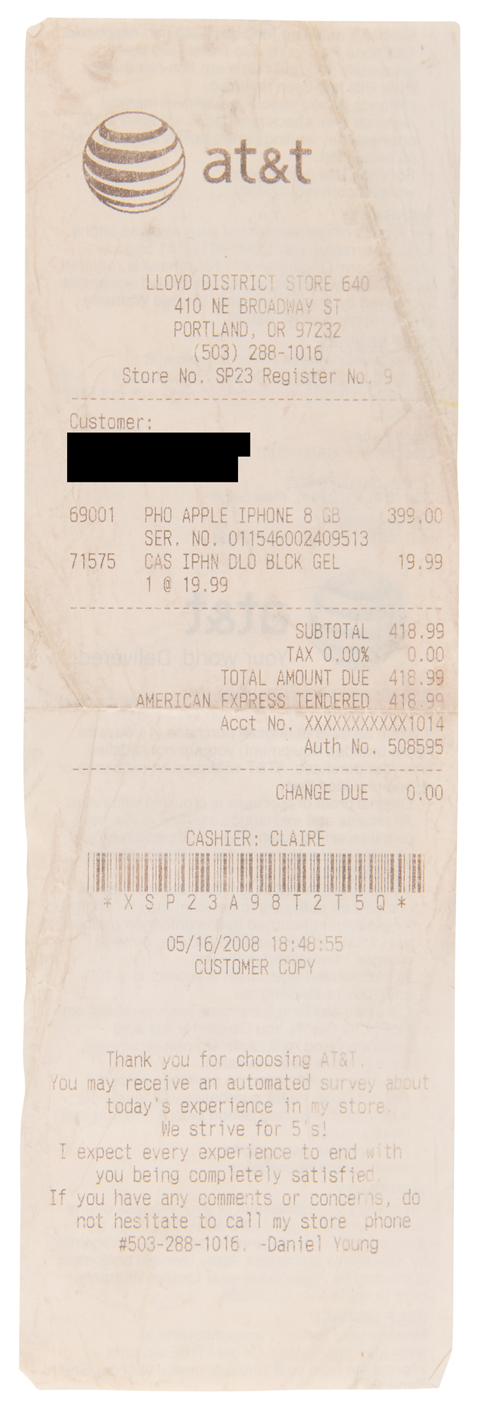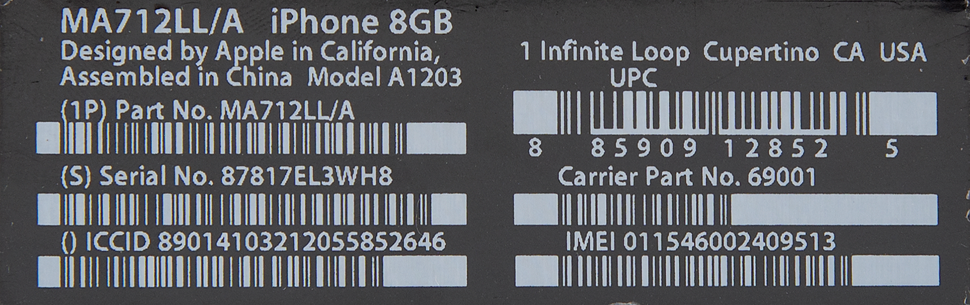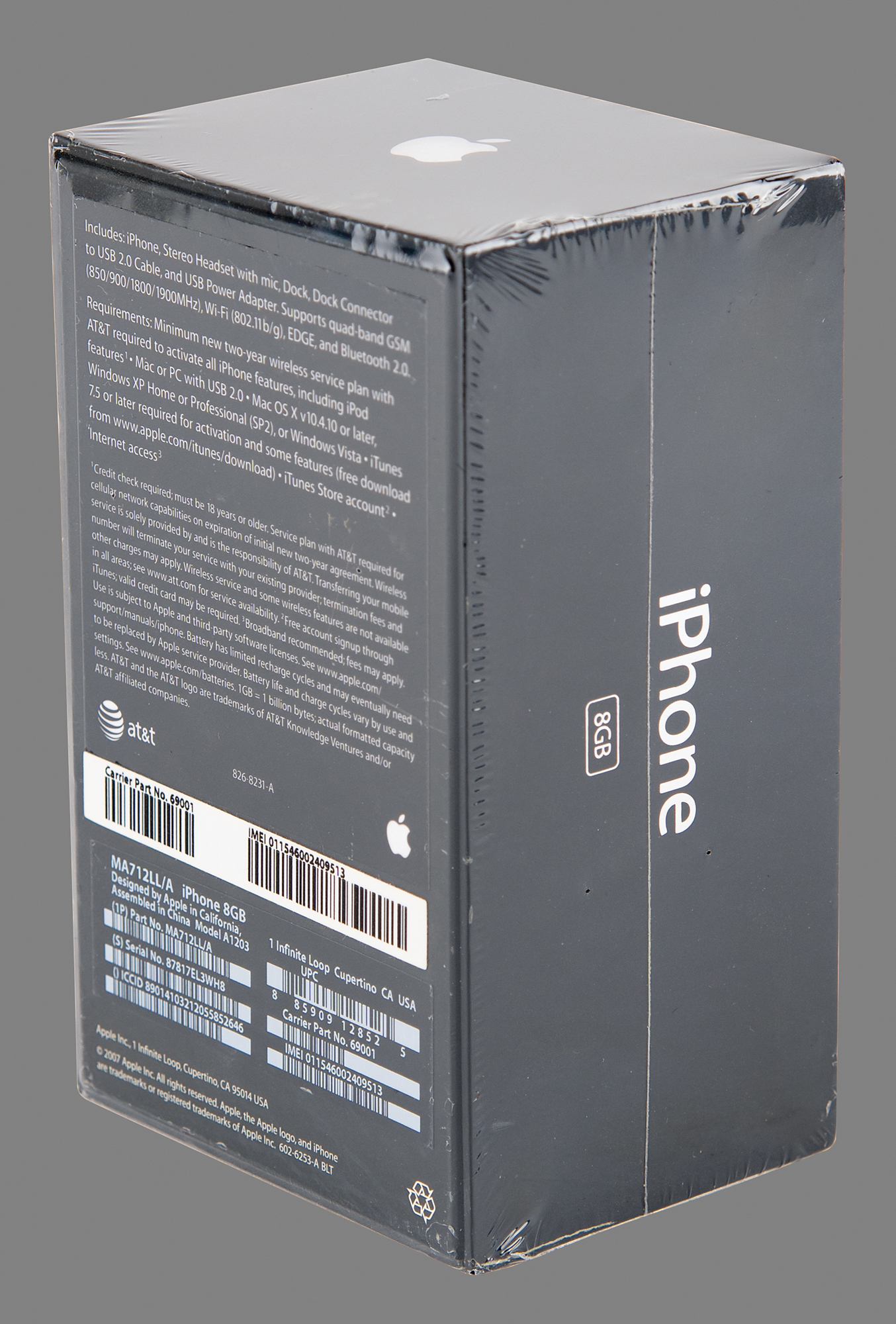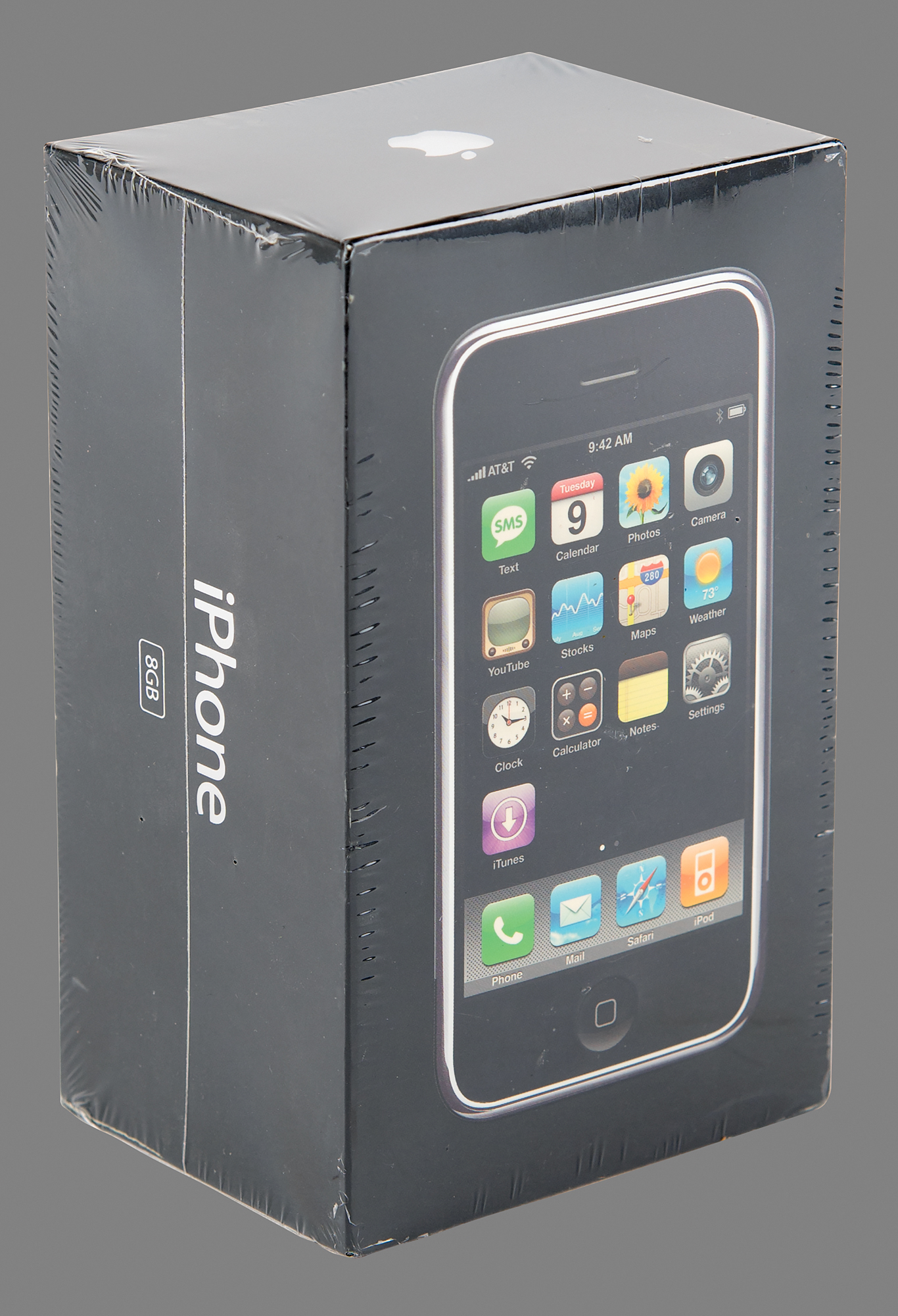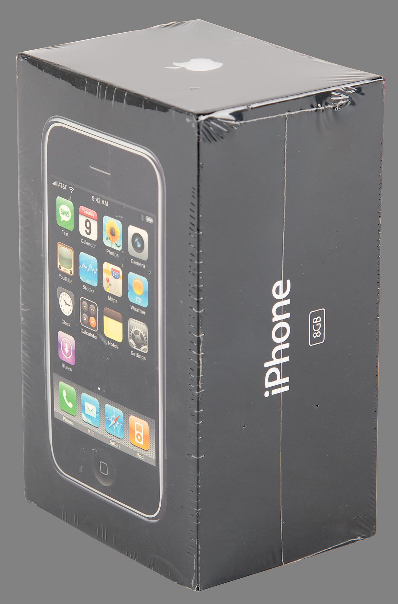 Unopened first generation original Apple iPhone, Model A1203, Part No. MA712LL/A (8GB), Serial No. 87817EL3WH8. The box features a life-size image of the iPhone with thirteen icons on the screen, indicating that it is from the later production run of original iPhones; the 13th icon, for iTunes, was introduced to the packaging in late 2007. In brand new, factory-sealed condition. Accompanied by the original sales receipt from the AT&T store in Portland, Oregon, dated May 16, 2008.