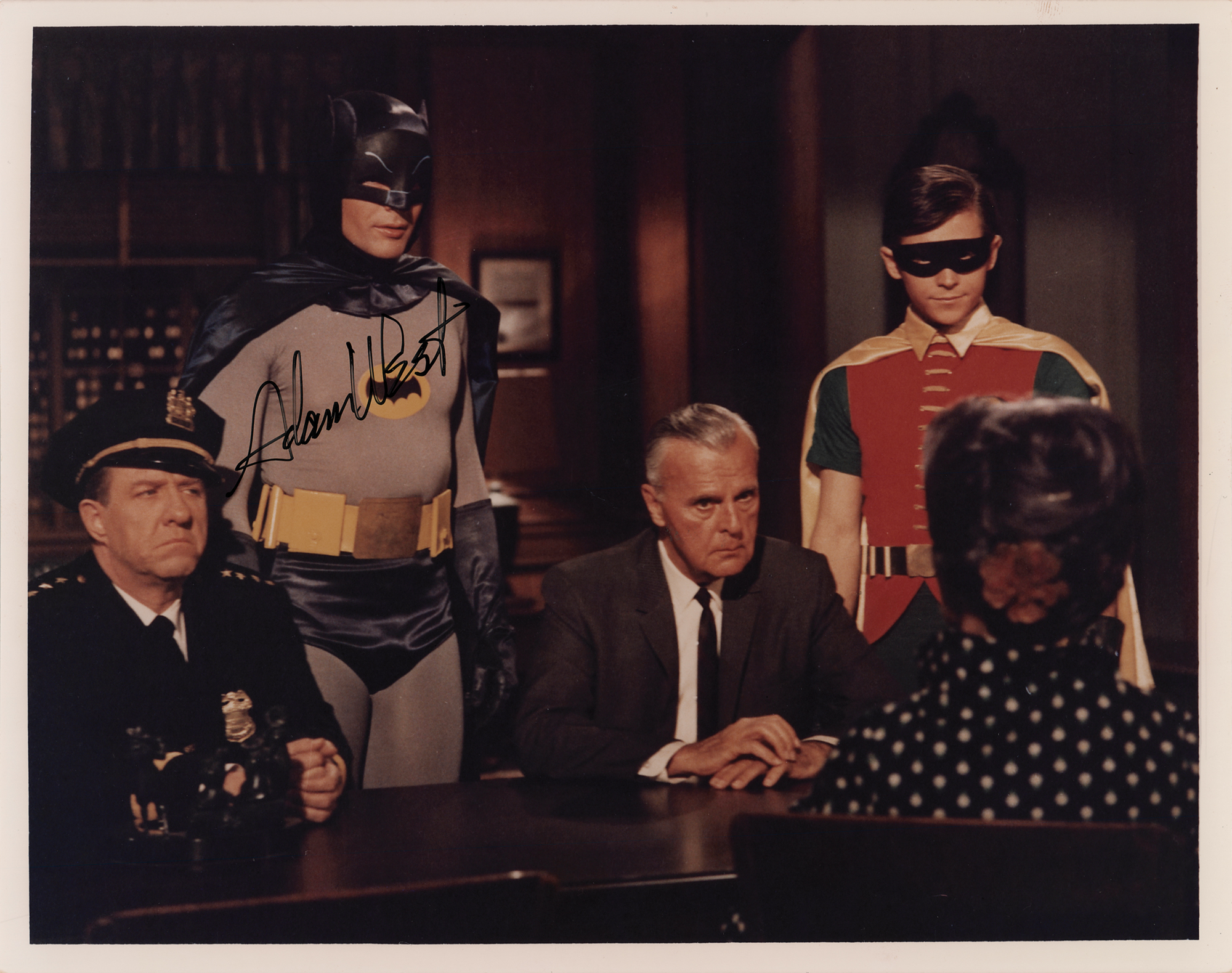 Color glossy 10 x 8 photo of a scene from the classic 1966 Batman movie featuring Batman, Robin, and Commissioner Gordon, signed in black felt tip, "Adam West." In fine condition.