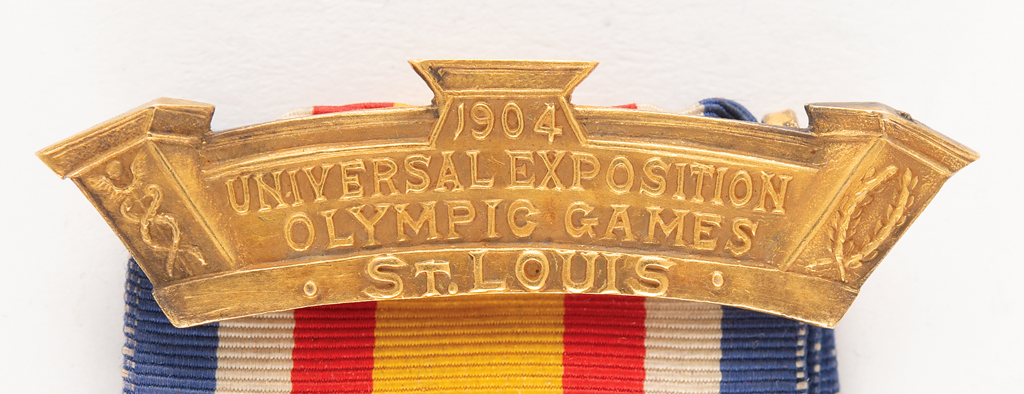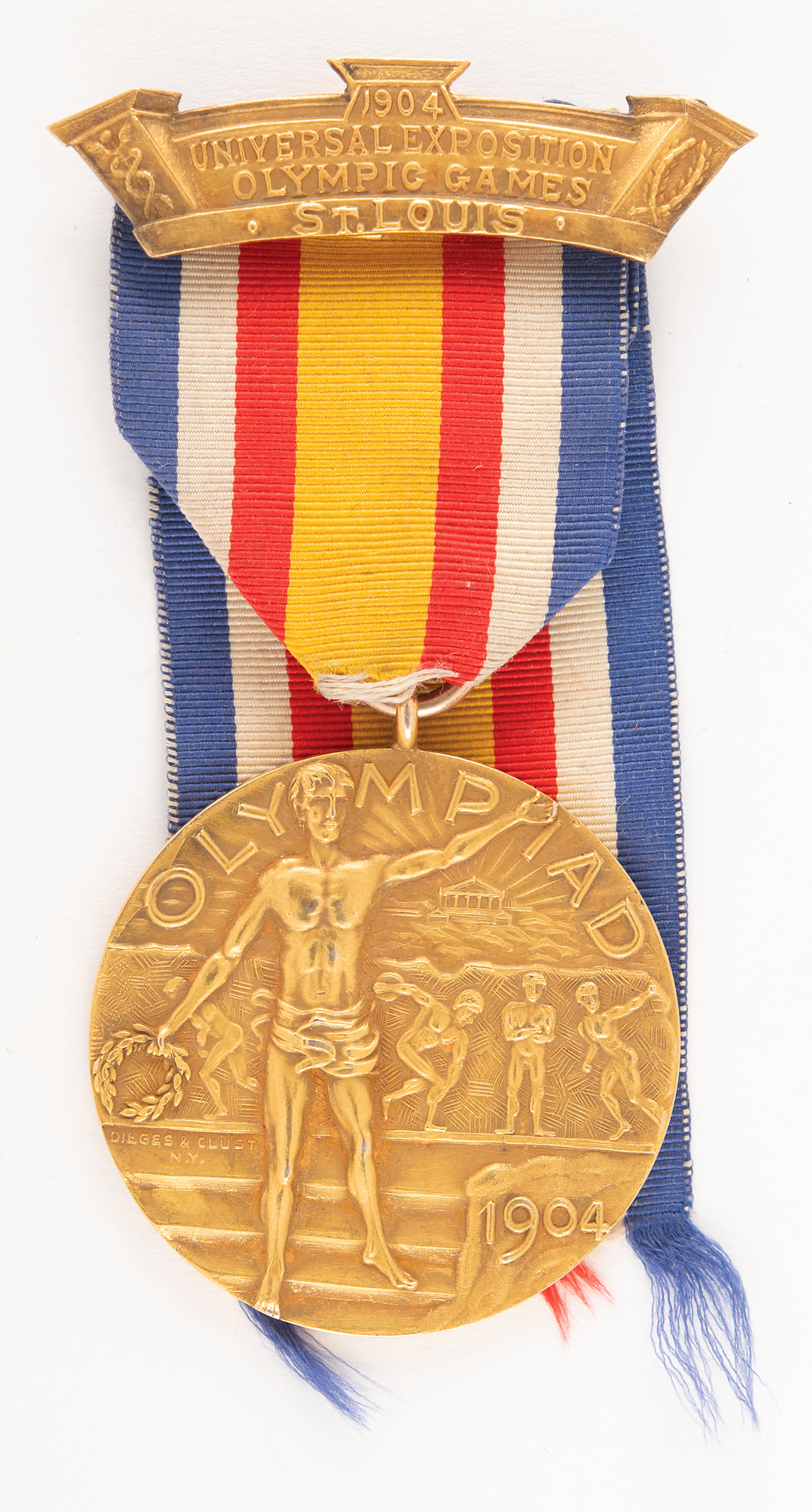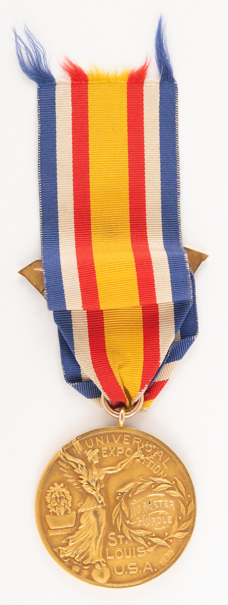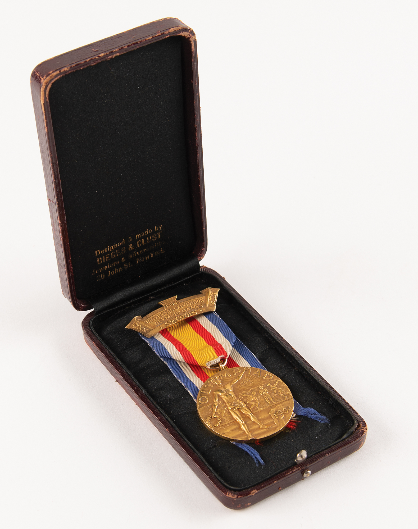 Incredibly rare winner's medal issued for a first-place finish in the 110 meter hurdle event at the St. Louis 1904 Olympics. Gold, 39 mm, 30 gm, designed and minted by Dieges & Clust, New York. The front, inscribed "Olympiad, 1904," depicts a victorious athlete holding a wreath in front of an ancient Greek athlete frieze and the Acropolis. The reverse pictures a Standing Nike and bust of Zeus, engraved with the event's name within a wreath, "110 Meter Hurdle." The medal is suspended from its original blue, white, red, and gold ribbon with gold clasp, featuring raised text, "1904, Universal Exposition, Olympic Games, St. Louis." Complete with its worn original leather hinged presentation case, gilt-stamped on the top with the legend: "Medal for Olympic Games, Universal Exposition, St. Louis U.S.A., F. J. V. Skiff, Dir. of Exhibits, Jas. E. Sullivan, Chief."