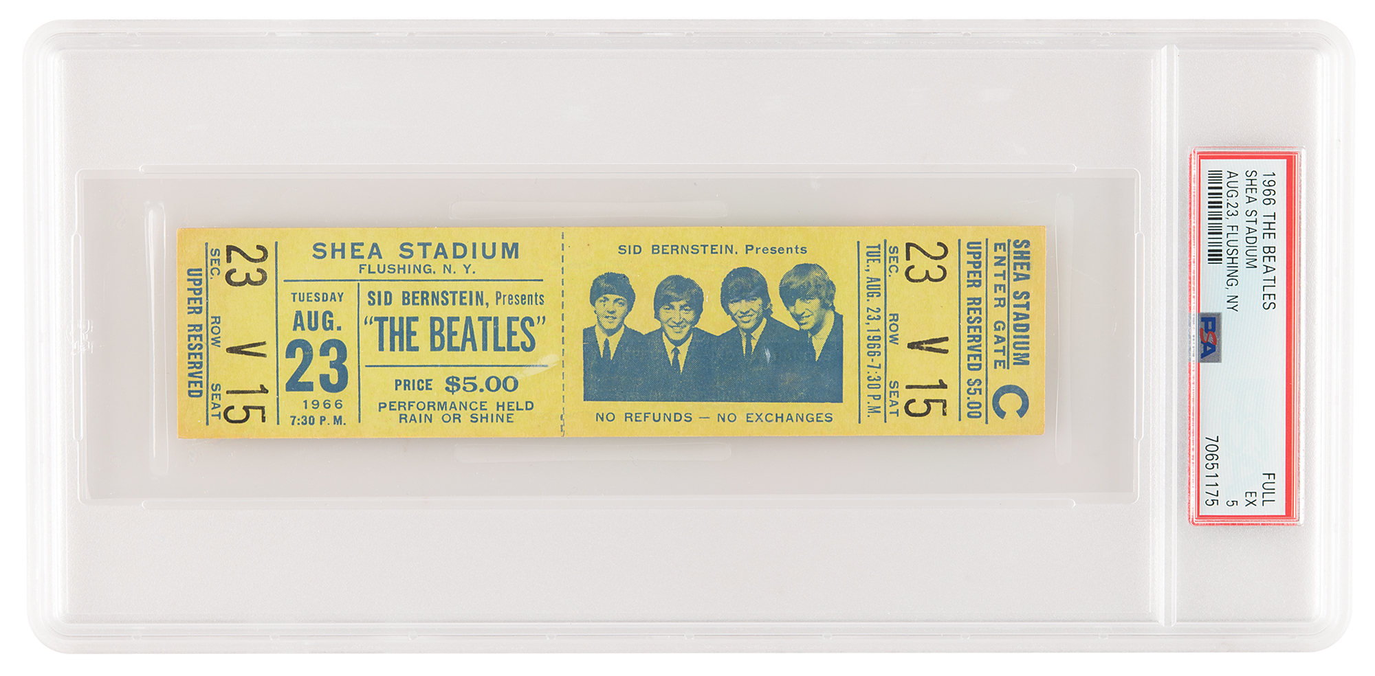 Unused ticket for the Beatles' famous concert at Shea Stadium in New York on August 23, 1966, for admission to the upper reserved section. The ticket, measuring 6.25 x 1.5, is issued for "Sec. 23," "Row V," "Seat 15," and features an image of the 'Fab Four' on the right side. Encapsulated and graded by PSA as "FULL EX 5."