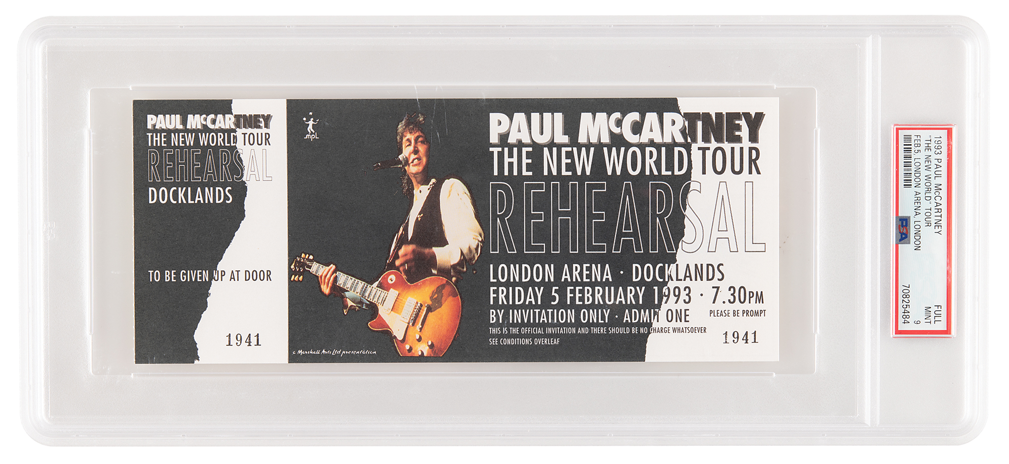Full ticket to Paul McCartney's rehearsal concert at London Arena, Docklands, on February 5, 1993, prior to kicking off 'The New World Tour.' The ticket, measuring 8.25 x 3.25, is marked as no. "1941." In fine condition. Encapsulated and graded by PSA as "FULL MINT 9."