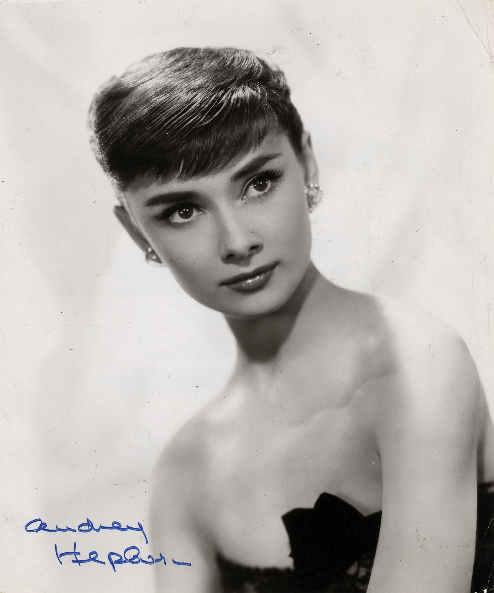 Lovely glossy 7.25 x 8.75 head-and-shoulders portrait photo of Audrey Hepburn during a promo shoot for the 1954 film Sabrina, signed neatly in the lower left in blue felt tip. Reverse bears several struck-through credit stamps. In very good to fine condition, with trimmed edges, scattered small creases, and a longer vertical crease passing down through her left shoulder. Accompanied by a full letter of authenticity from JSA.