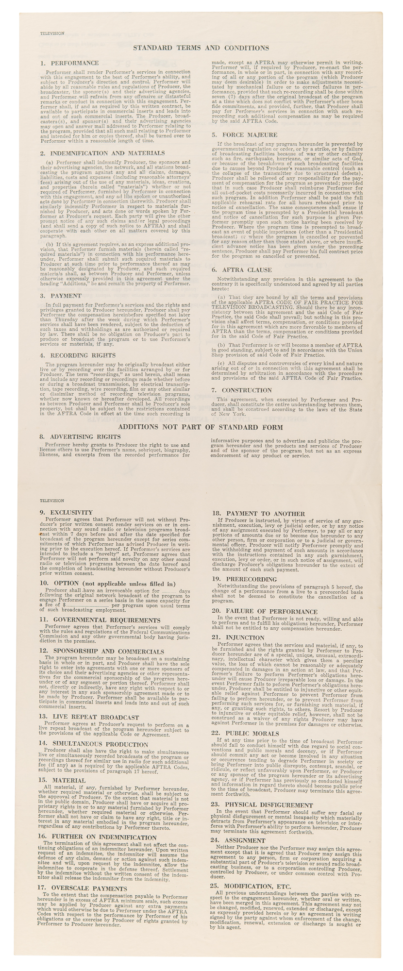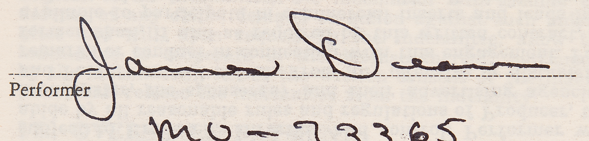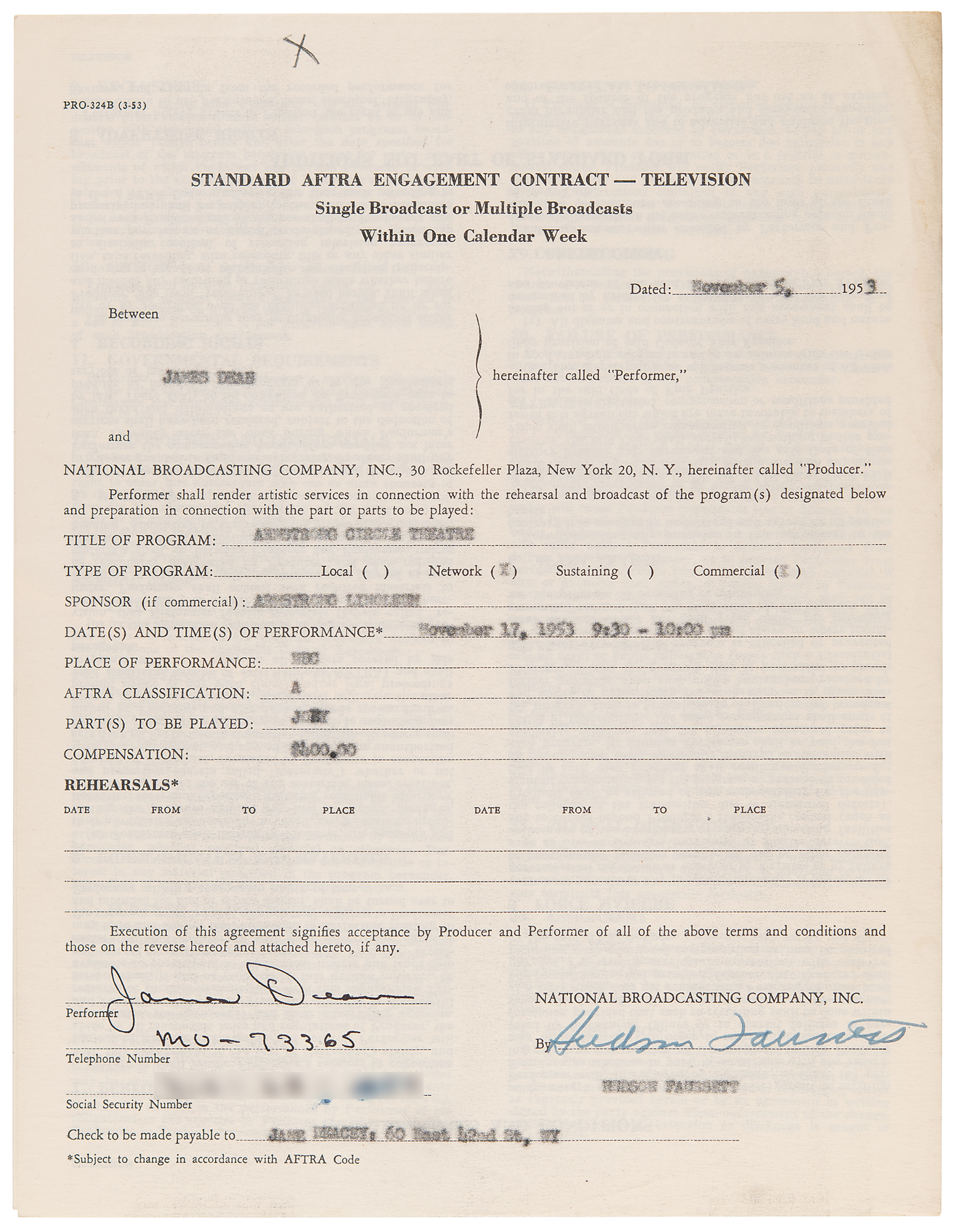 DS, three pages, 8.5 x 11, November 5, 1953. A Standard AFTRA television engagement contract between James Dean and NBC, with the former agreeing to the sum of $400 to play the part of “Joey” in an episode of Armstrong Circle Theatre to be aired on November 17, 1953. Signed at the conclusion in black ink by James Dean, who adds his telephone and social security numbers, and countersigned by NBC Producer Hudson Faussett. In fine condition. Accompanied by two letters of authenticity from JSA. Dean appeared as Joey Frasier, a down-on-his-luck young father with a sick child in need of medicine, in ‘The Bells of Cockaigne,’ the 12th episode of season four of the NBC anthology drama television series Armstrong Circle Theatre.