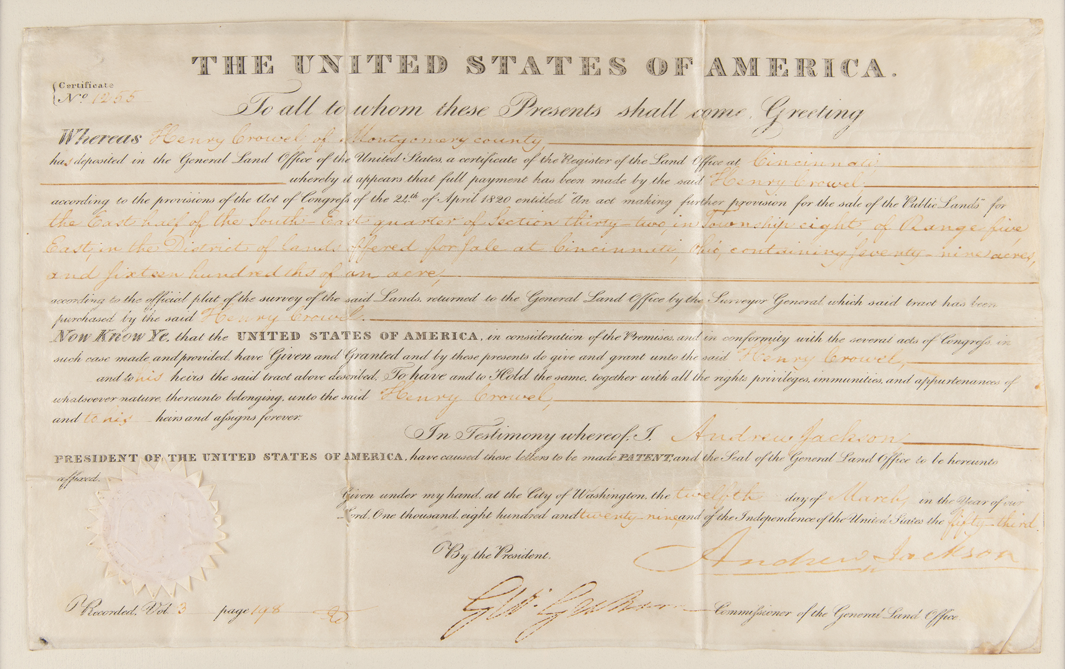Partly-printed vellum DS as president, one page, 15.5 x 9.75, March 12, 1829. President Jackson grants Henry Crowel of Montgomery County, Ohio, a tract of land at "Cincinnati, Ohio, containing seventy-nine acres, and sixteen hundredths of an acre." Signed at the conclusion by President Andrew Jackson, and countersigned by Commissioner of the General Land Office George Graham. The lower left retains the original white paper seal. Mounted and framed to an overall size of 21.75 x 15.75. In fine condition, with all handwriting light but legible.