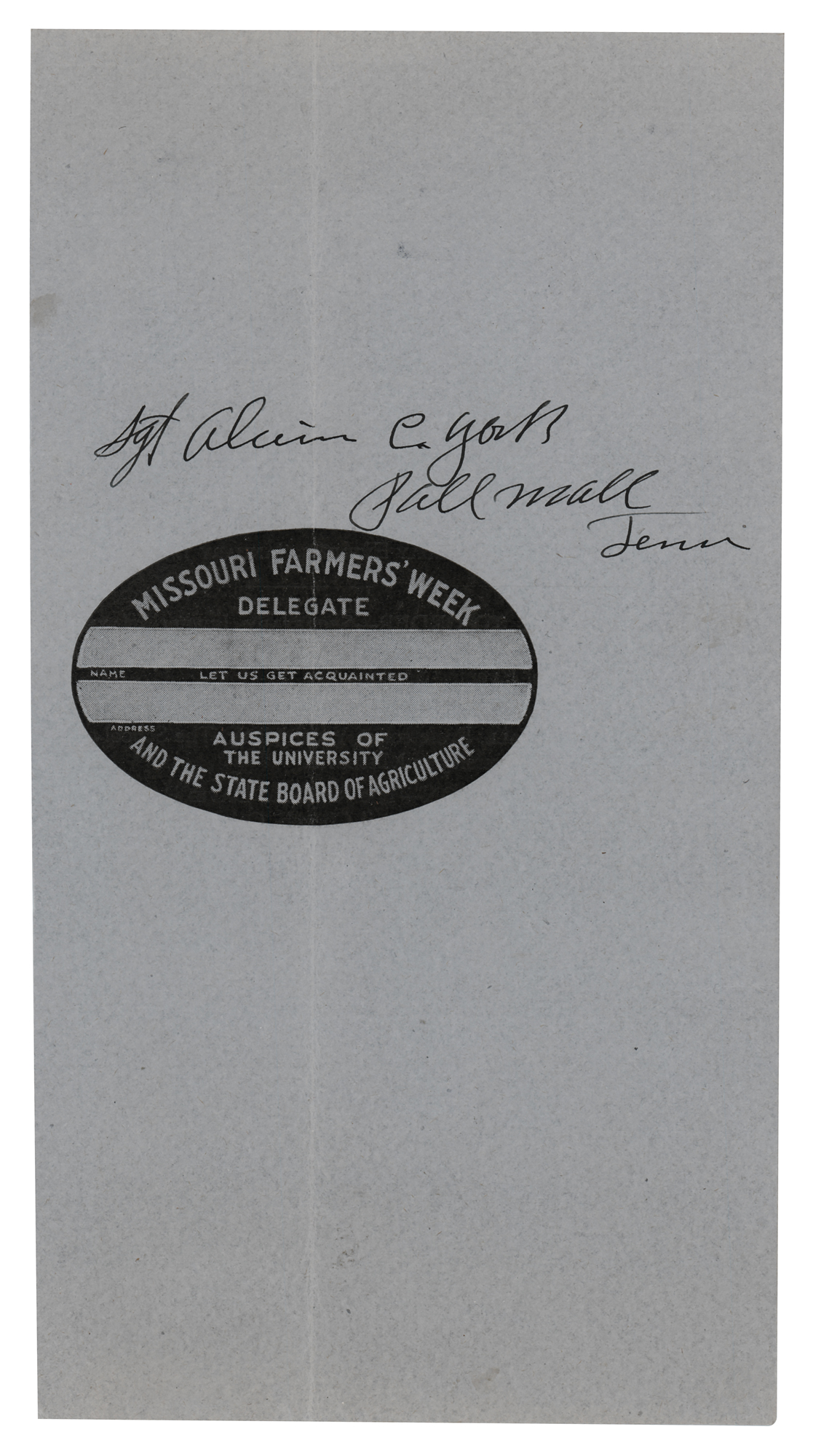 Ink signature, “Sgt. Alvin C. York, Pall Mall, Tenn,” on an off-white 4.75 x 9 sheet clipped from a 1927 program from the University of Missouri. In fine condition, with a central vertical fold.