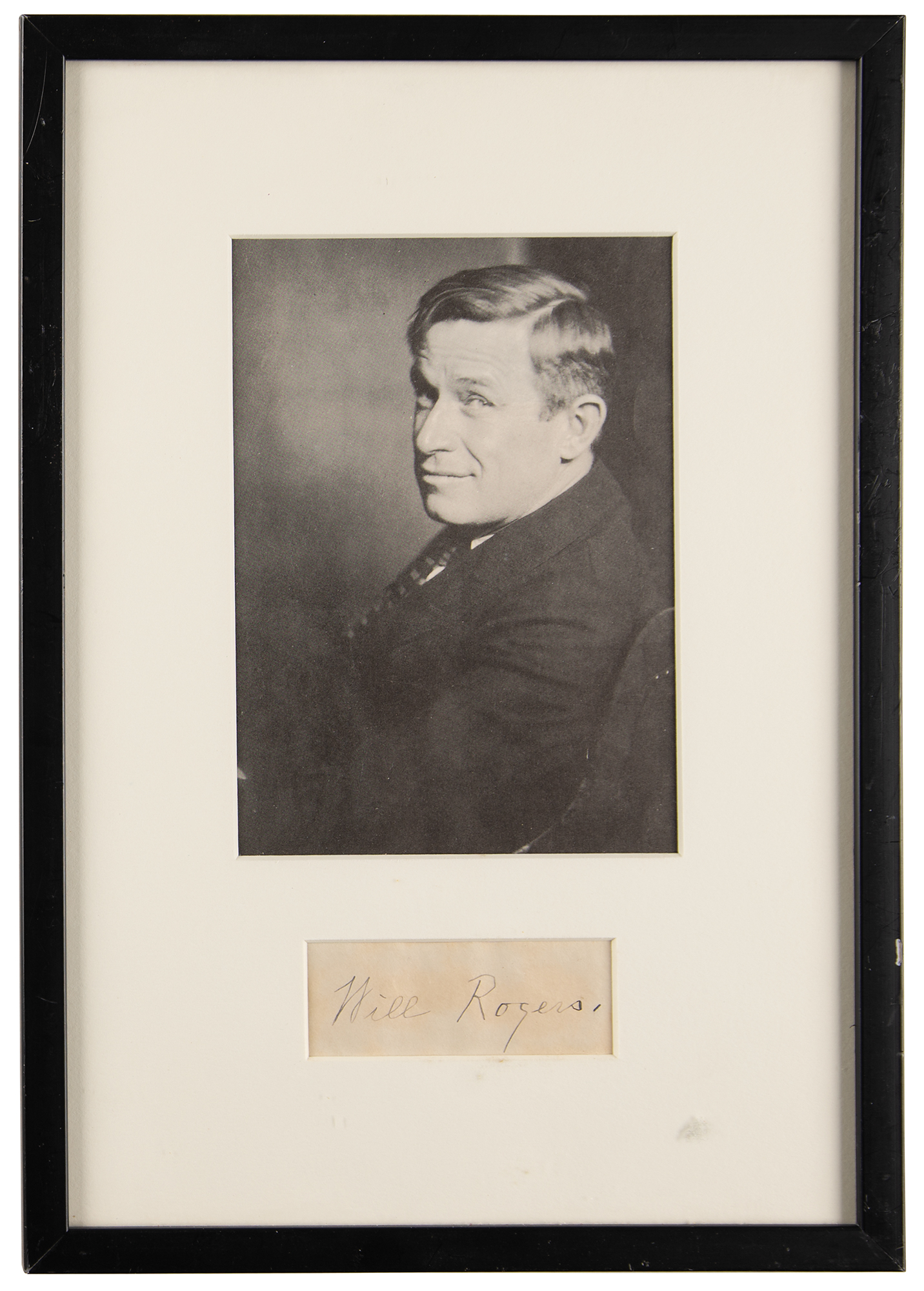 Ink signature, "Will Rogers,” on an off-white 3.25 x 1.25 sheet. Matted and framed with a portrait to an overall size of 9.75 x 14. In fine condition.