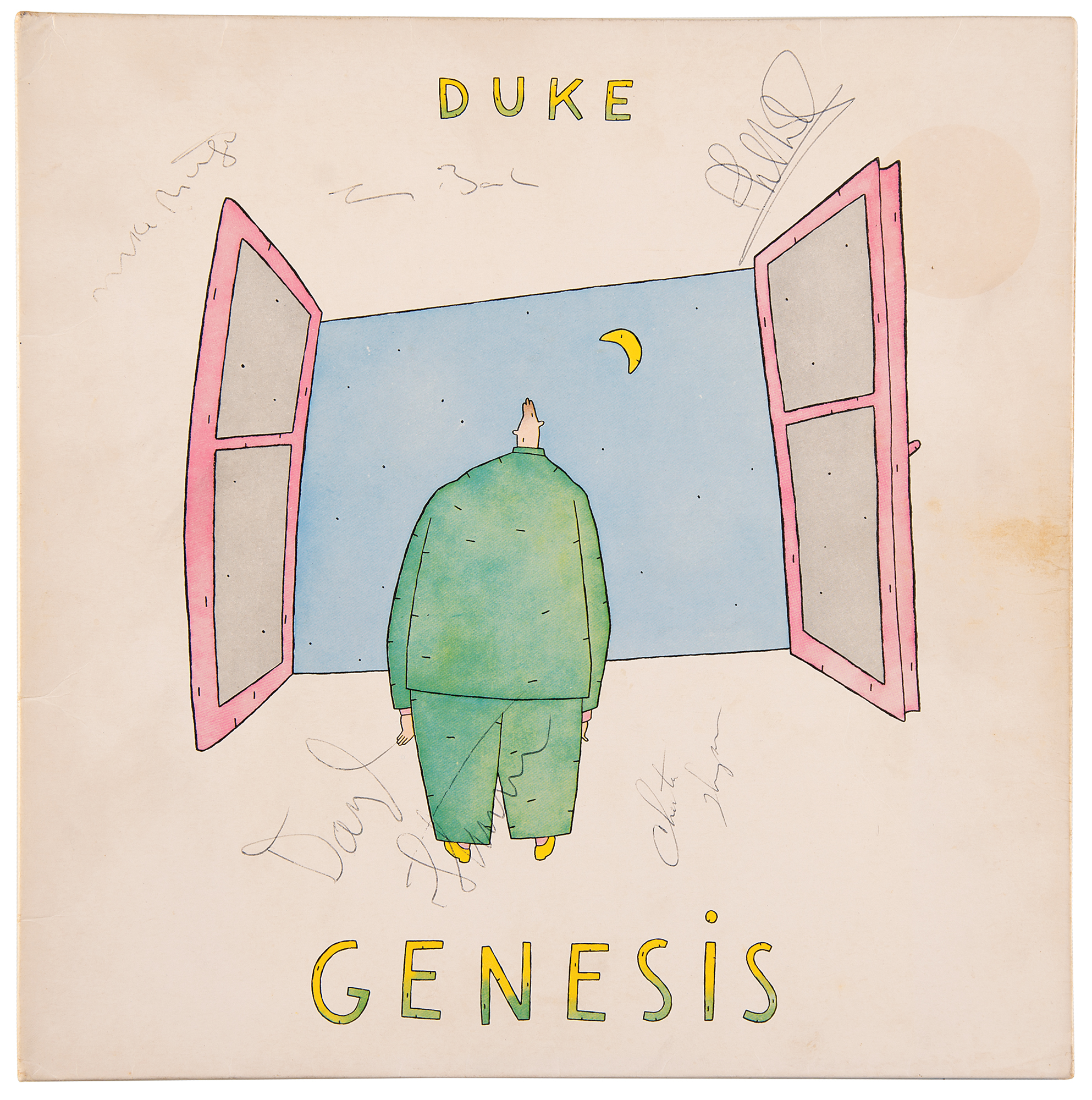 Duke album signed on the front cover in black ballpoint by Phil Collins, Tony Banks, Mike Rutherford, Daryl Stuermer, and Chester Thompson. In very good to fine condition, with a light sticker stain, and some soiling in the margins. The record is not included.