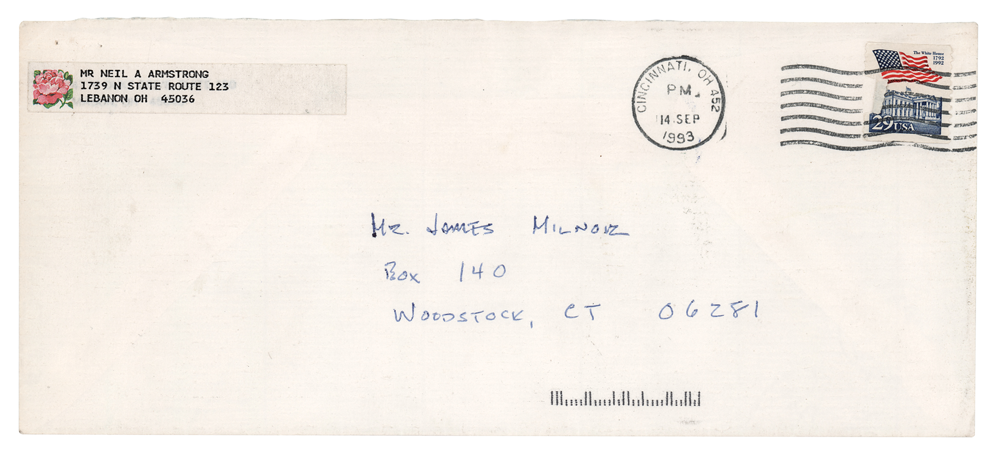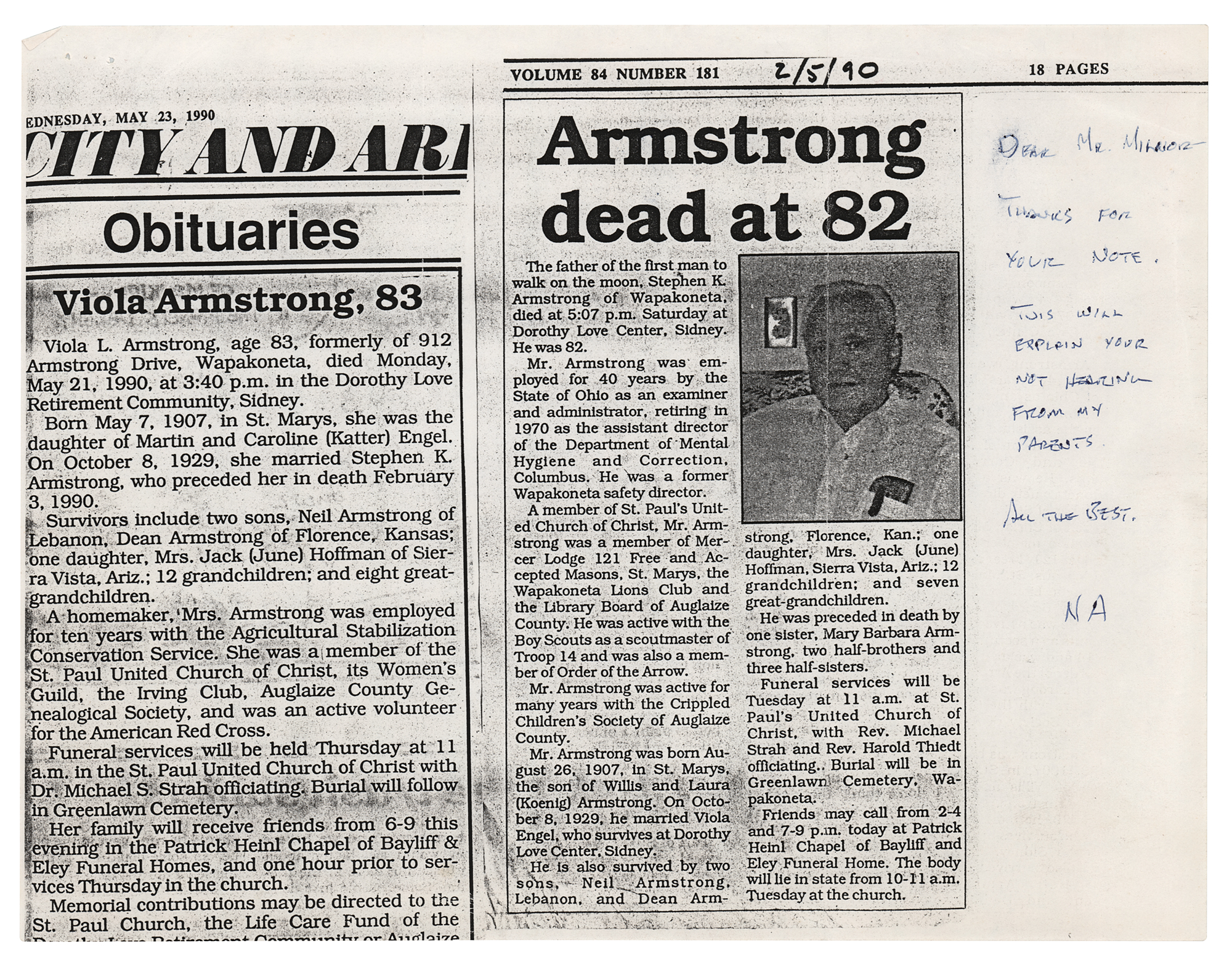 ANS signed "N. A.," penned in the margin of a Xerox copy of his parents' obituaries, one page, 11 x 8.5, no date but postmarked September 14, 1993. Handwritten note to James Milnor, in full: "Dear Mr. Milnor—Thanks for your note. This will explain your not hearing from my parents. All the best." In fine condition, with two mailing folds. Accompanied by the original mailing envelope, addressed in Armstrong's hand.