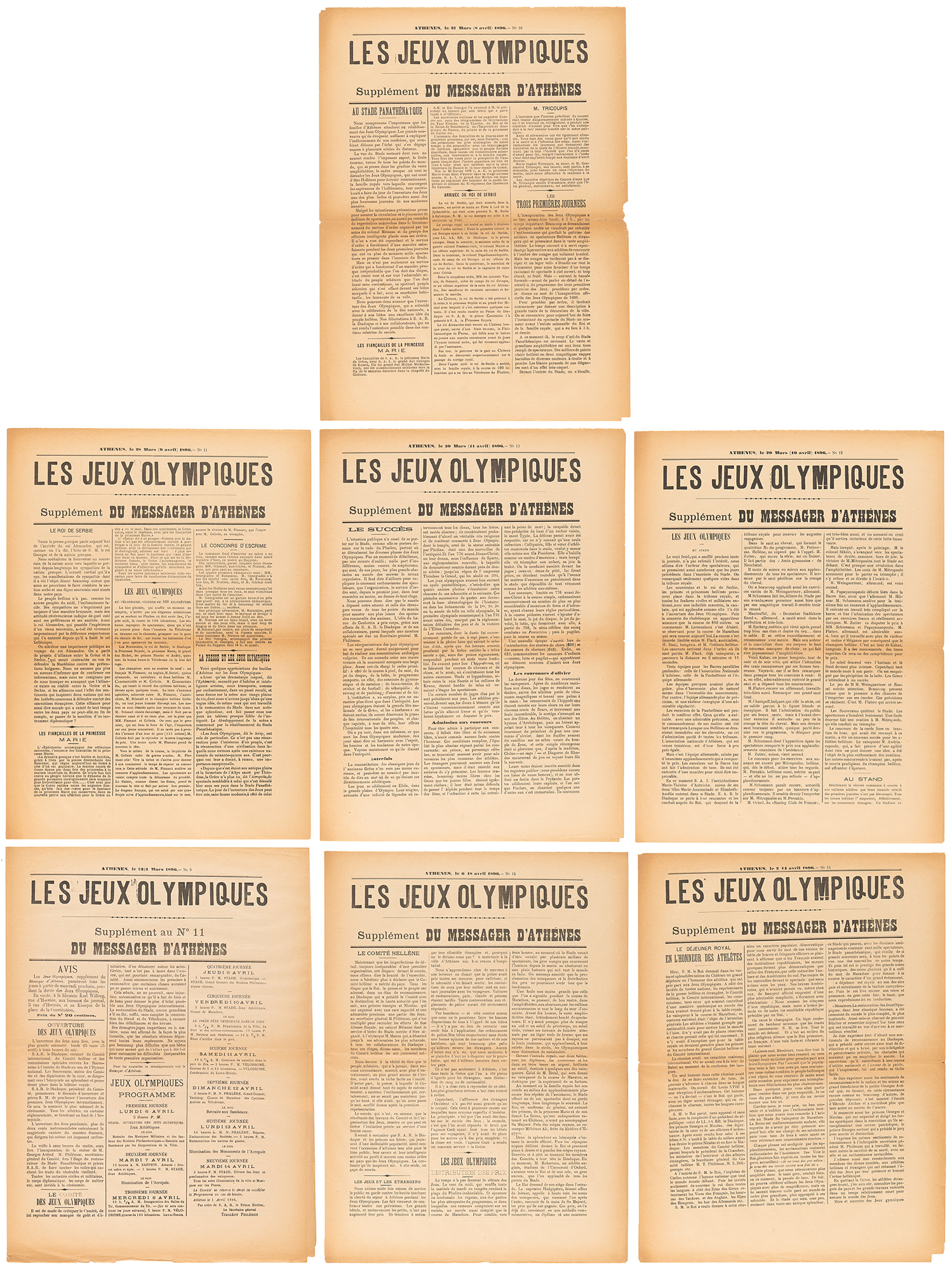 Scarce grouping of seven issues of ‘Les Jeux Olympiques’ [The Olympic Games], a supplement published in the French newspaper Messager d'Athenes, which was published between February 8th and April 18, 1896, and contained many references to the preparations for and the events of the first modern Olympic Games. Issues include: March 23rd (No. 9), March 27th (No. 10), March 28th (No. 11), March 29th (No. 12), March 30th (No. 13), April 2nd (No. 14), and April 6th (No. 15). In overall very good condition, with tears to the edges, and along the partially separated intersecting folds.