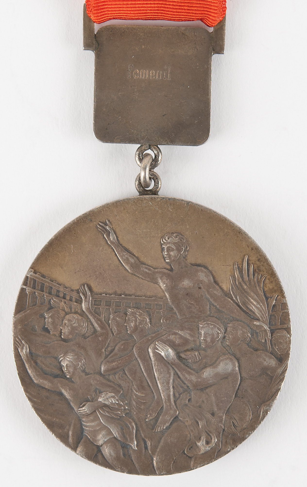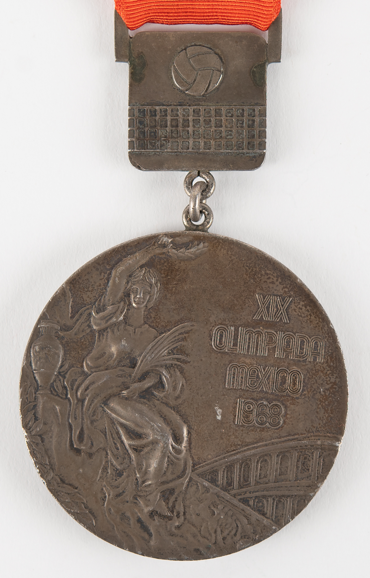 Winner's medal issued for women's volleyball at the Mexico City 1968 Summer Olympics. Gilt silver, 60 mm, 125 gm, originally designed by Giuseppe Cassioli. The front is inscribed, "XIX Olimpiada Mexico 1968," and features a 'Seated Victory' with the Colosseum in the background; the reverse depicts a victorious athlete with a palm branch being carried by several jubilant athletes. A small plaque attached to the top of the medal bears the volleyball pictogram of a ball and net, engraved "Femenil [Women's]" on the reverse, suspended from the original orange ribbon. The medal retains only traces of the gold plating, typical of the issue.
