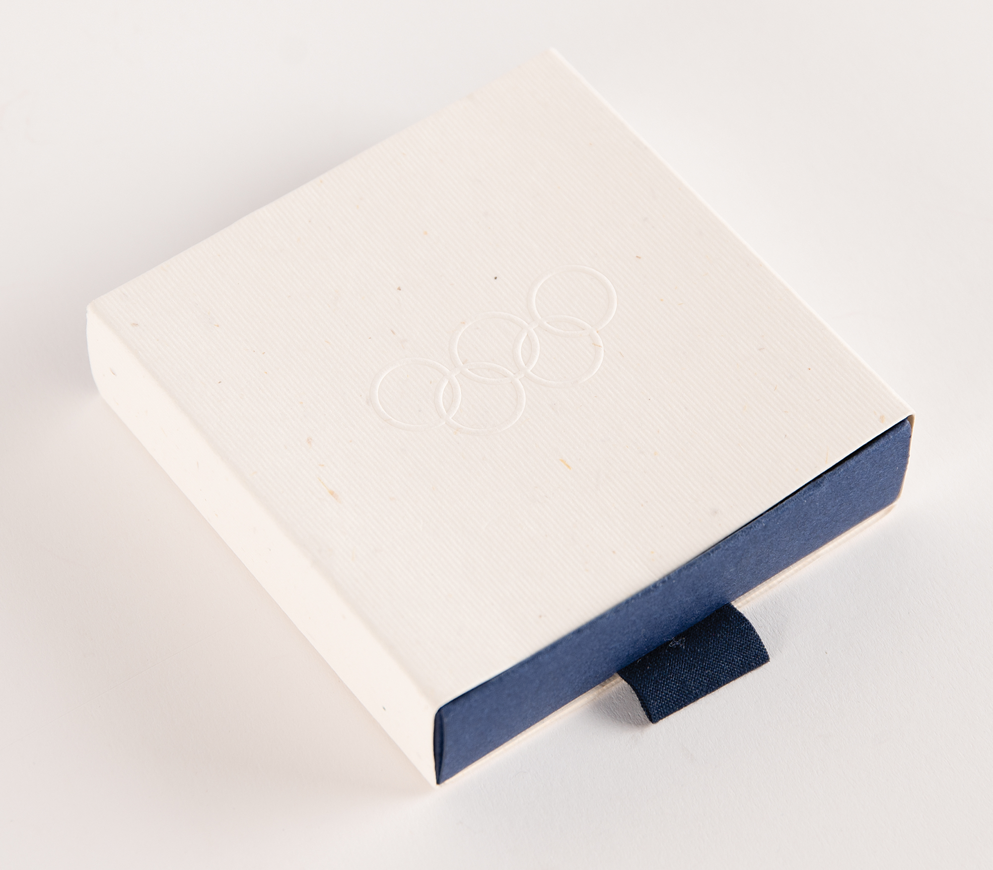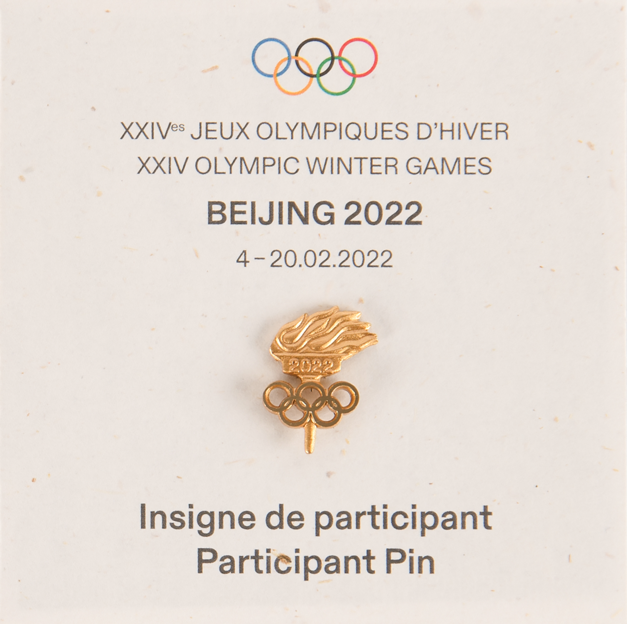 Official gold-plated participation pin from the Beijing 2022 Winter Olympics. 1 gm, 12 mm x 19 mm, which features the Olympic rings under a flaming 2022 torch. Reverse features the mint mark, "Bertoni, Milano," and the serial number, "22-1510." Includes the original booklet, paper presentation holder, and slipcase with matching label. As no participation medals were issued for the 2022 Beijing Games, the athlete’s participation pin has become the de facto 2022 Beijing 'participation medal' for collectors.