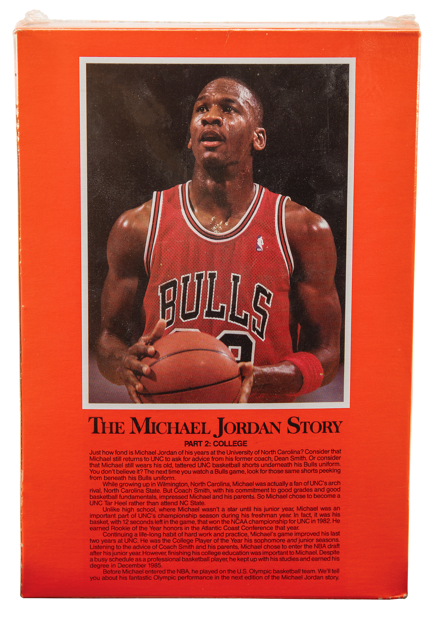 Brand new, sealed and unopened 1989 General Mills Wheaties box featuring a great image of Michael Jordan soaring through the air in his iconic Chicago Bulls #23 jersey, advertising an included poster of the basketball legend on the front. In very fine condition.