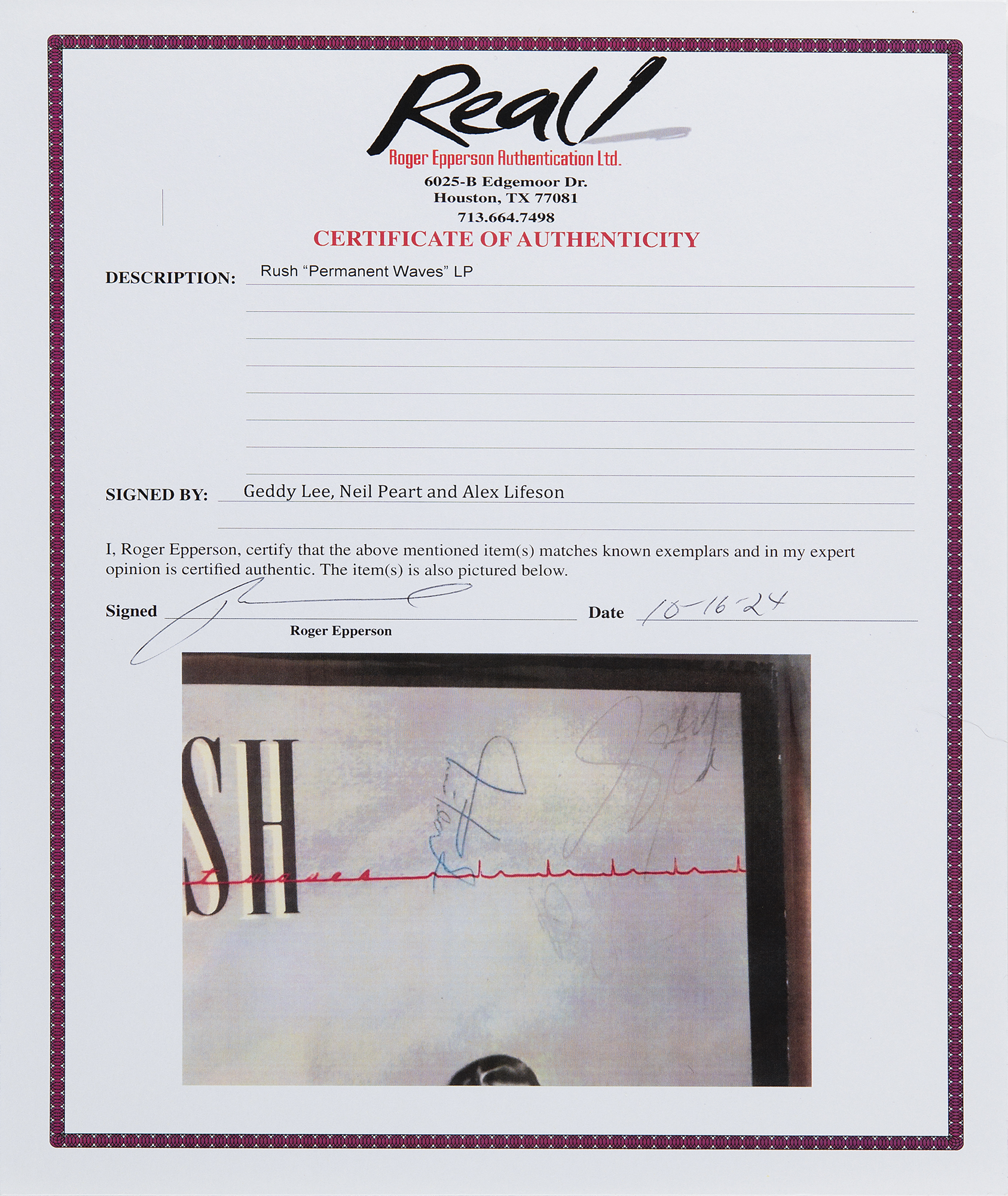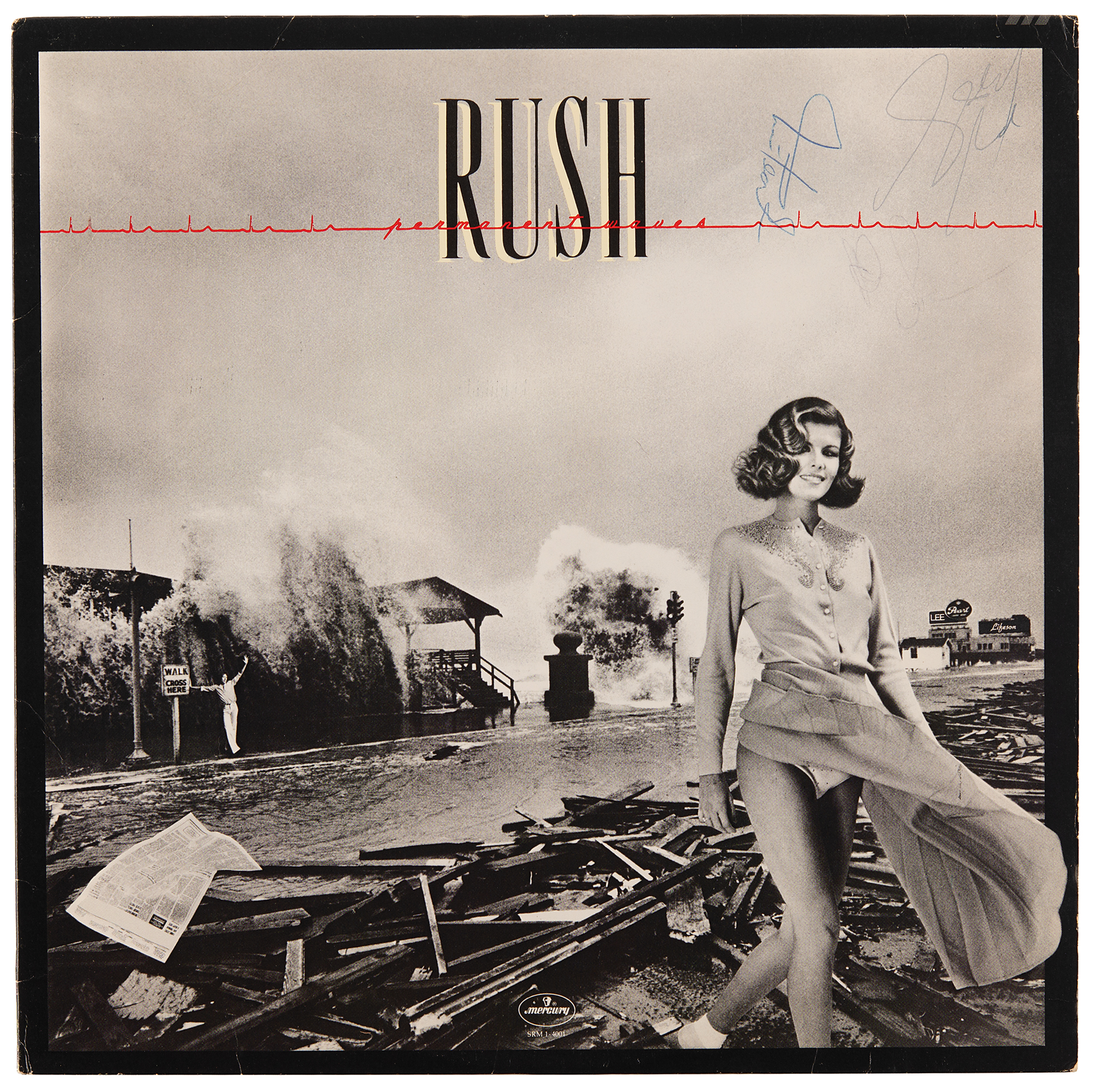 Permanent Waves album by Rush, signed on the front cover in ballpoint by Geddy Lee, Neil Peart, and Alex Lifeson. In fine condition, with a crease to the upper left corner, and Alex's signature very light but legible. The record is included. Accompanied by a full letter of authenticity from REAL.